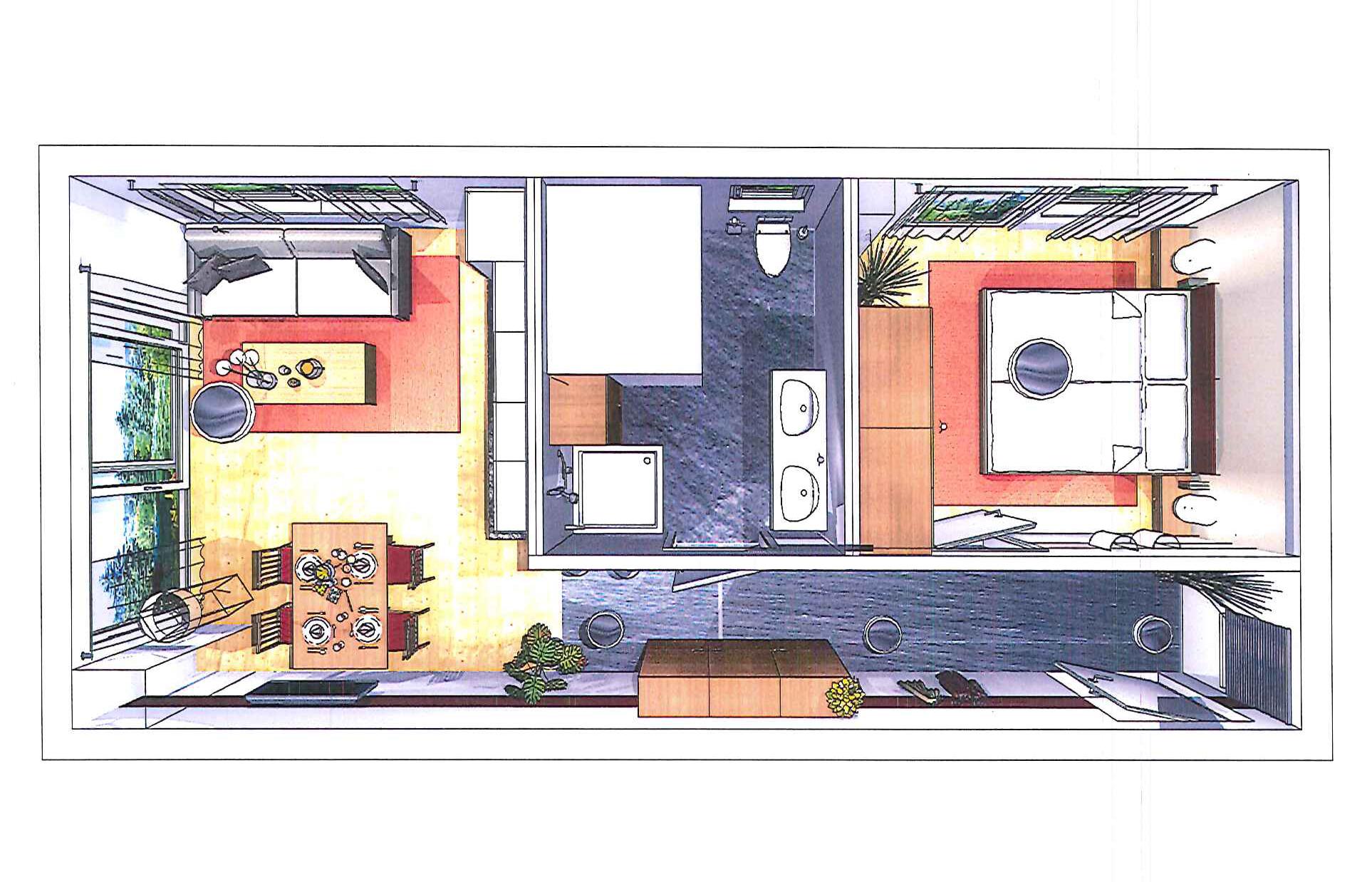 Apartment mit 55m², 1 Doppelzimmer, 1 Wohnraum/Küche mit Ausziehcouch für 2 Personen, Bad mit Sauna, Balkon. Für 2 bis 4 Personen