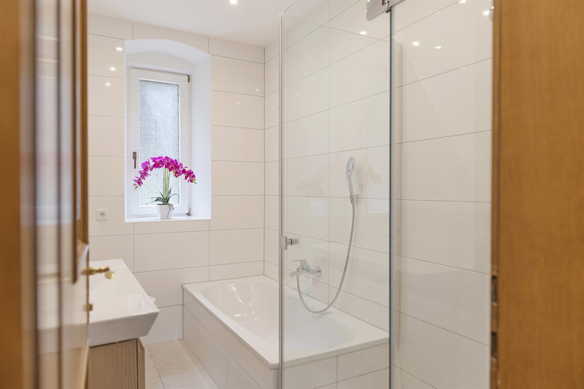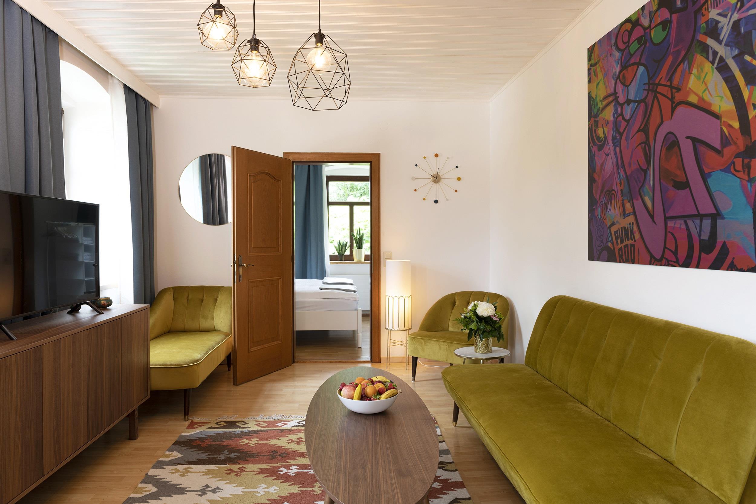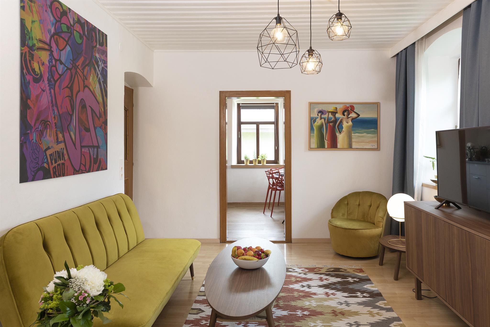 Im Hochparterre befindet sich neben einer voll ausgestatteten Küche, ein komfortables Wohnzimmer mit Satelliten-TV. Im Hochparterre sind 3 Schlafzimmer und ein Wohnzimmer. Das Bad verfügt über eine Dusche, WC und eine Badewanne, was nach einem langen Wandertag, oder einer Skitour besonders wohltuend ist. Ausserdem können Sie eine Wasch-und Trockenmaschine im Keller kostenfrei nutzen. Alle Betten sind mit frischer, weißer Hotelbettwäsche ausgestattet. Bücher und zahlreiche Spielsachen für die Kleinsten, stehen vor Ort zur Verfügung.