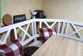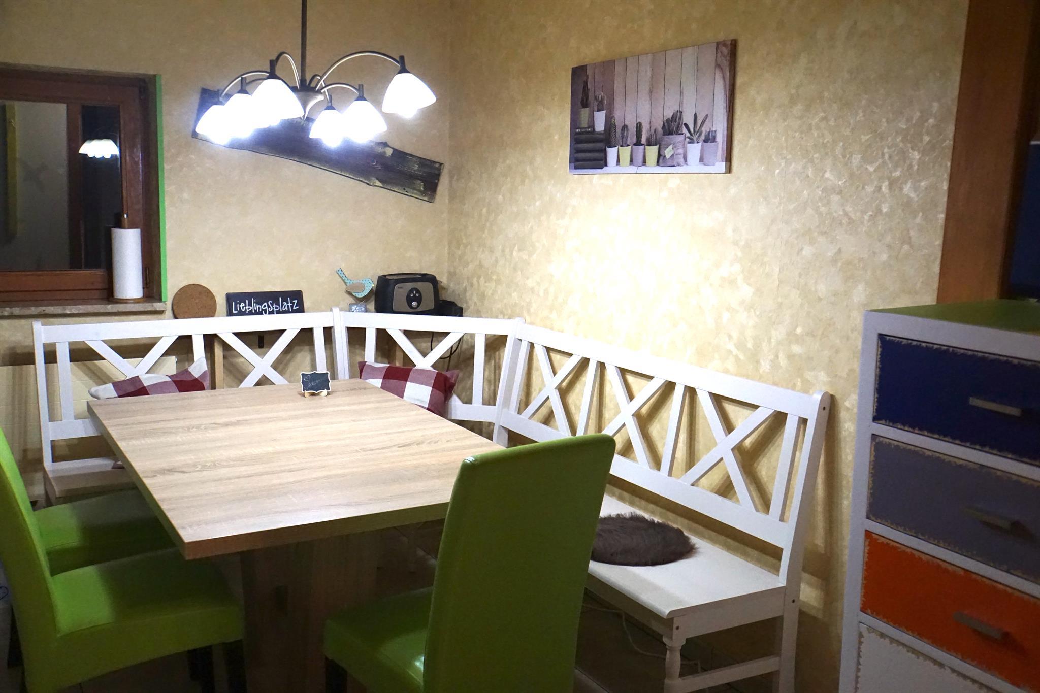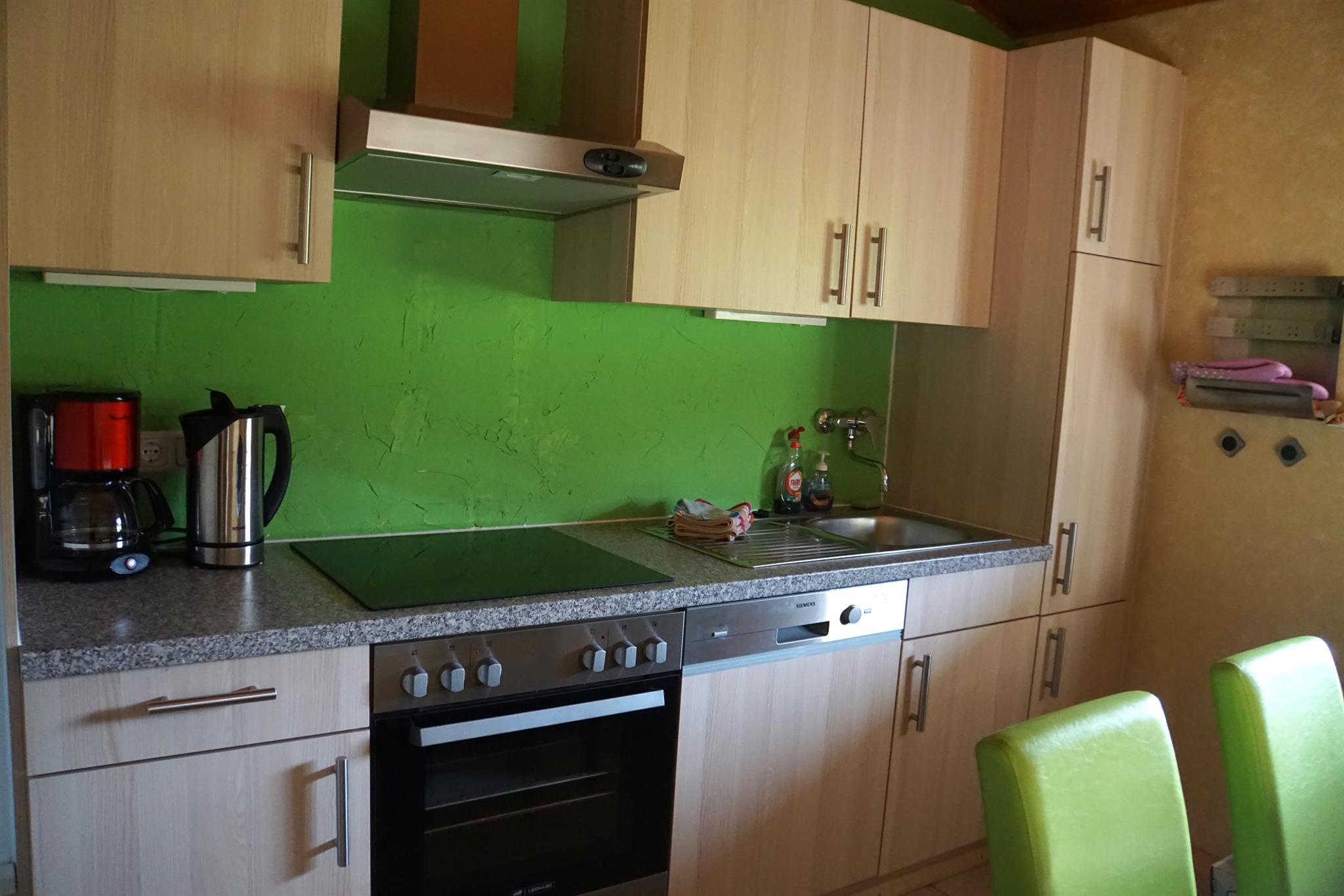 · voll ausgestatte Einbauküche (Herd, Backofen, Spülmaschine, Mikrowelle, Kühlschrank mit separatem Gefrierteil, Kaffeemaschine, Tchibo-Kapselmaschine, Wasserkocher, Toaster.... ) mit Essplatz für 8 Personen (Eckbank + Stühle)