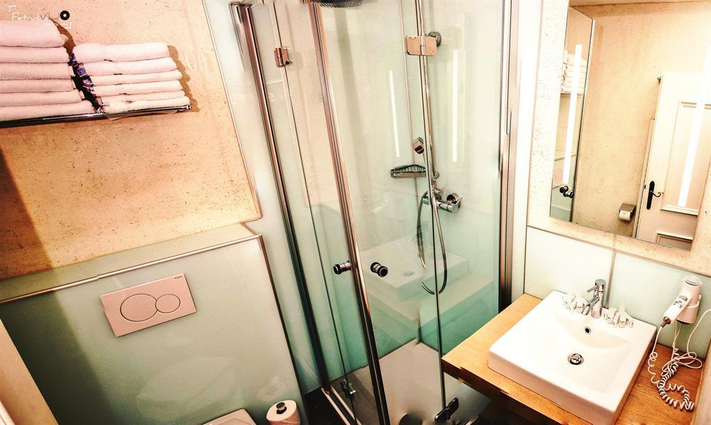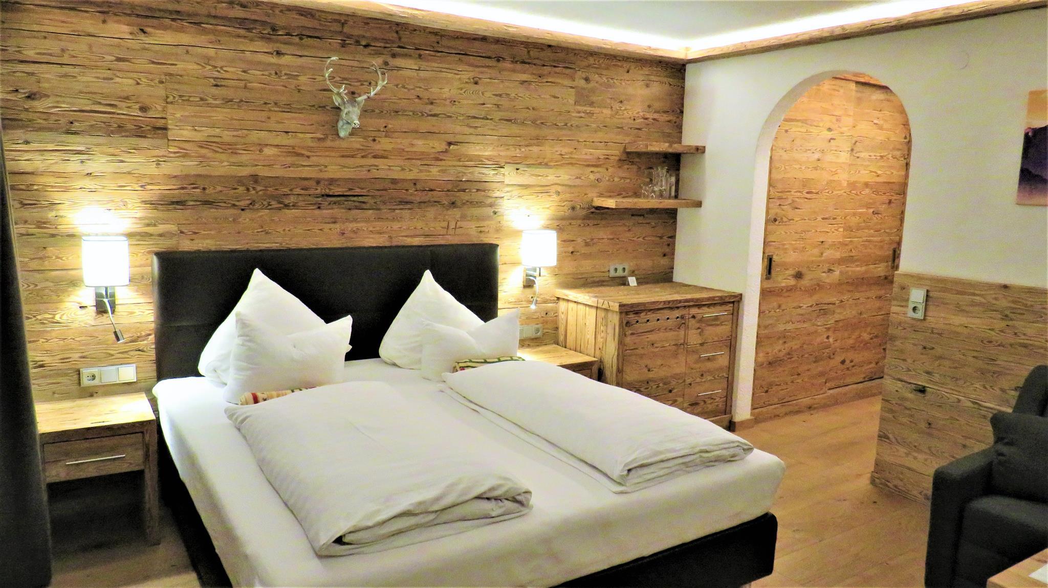 Luxuriös eingerichtetes Doppelzimmer im Alpine Chalet style (~32 qm) mit Holzboden, Luxus-Boxspringbett, schalldichte Fenster, Flat-TV und Minibar. Modernes Badezimmer mit Dusche und kleine Terrasse.