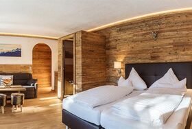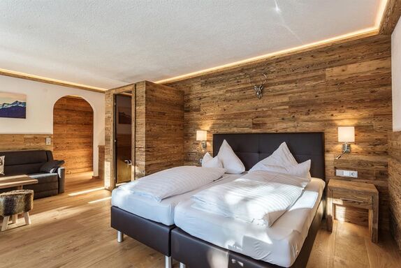Luxuriös eingerichtete 1-Zimmer Suite im Alpine Chalet style (~42 qm) mit privater Physiothermkabine, Holzboden, Luxus-Boxspringbett, Flat-TV und Minibar. Walk-In Dusche mit rainshower und großer Balkon mit Bergblick.