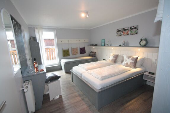 Unsere Familienzimmer verfügen über einen Hauptraum mit einem Doppelbett und einem Zusatzbett, das auch als Sofa genutzt werden kann. Ein separates kleines Zimmer mit einem Etagenbett ( 90x200) ist das ideale Kinderzimmer oder auch für eine weitere erwachsene Person. Ausstattung:Duschbad, Sat-TV , Schreibpult und ein schöner Balkon mit Sitzgelegenheiten und Wäscheständer .