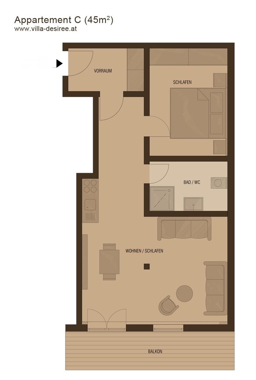 Wer mehr Platz wünscht, ist mit unserer geräumigen und gemütlichen Suite C 48 m² gut beraten. die Suite ist mit einer kleinen Küche mit Kühlschrank ausgestattet.