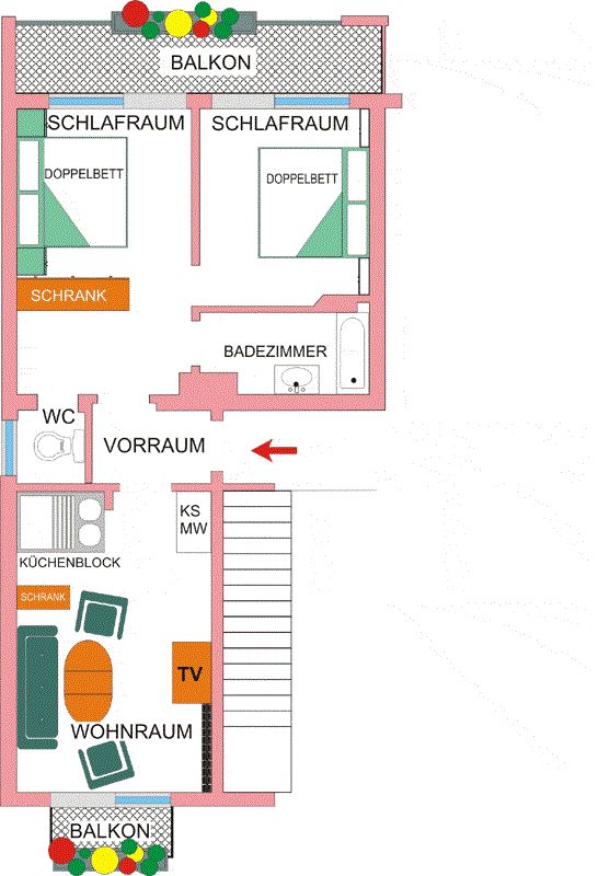 FeWo mit zwei getrennten Schlafräumen, Wohnraum, Bad/Dusche, WC, Kochnische, Radio, TV, Tresor, WLAN, 2 Balkonen, Badekarten, Fahrräder, Sauna