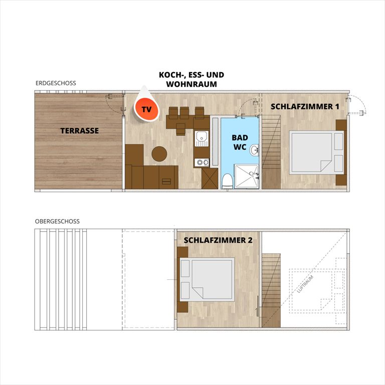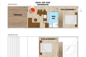 Ein Schlafzimmer und eine Schlafkoje mit Panoramafenster im Obergeschoss bieten Platz für 4 Personen (die Betten sind bezogen). Die kleine Terrasse gewährt einen schönen Ausblick auf unseren kleinen Forellenteich (Fischzucht), der leider zum Baden nicht geeignet ist. Unsere Gäste haben jedoch im nahegelegenen Strandbad Laggner in Steindorf kostenlosen Zutritt.
