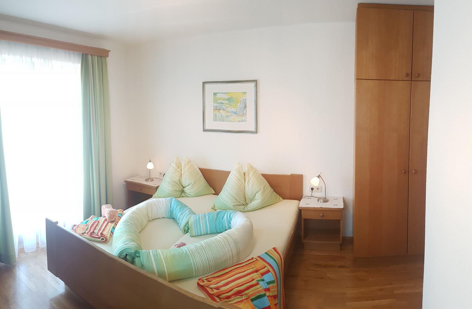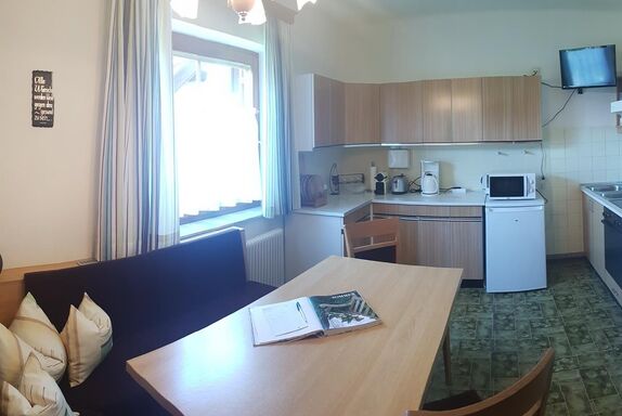 Die behagliche Ferienwohnung liegt im Parterre. Die gemütliche Wohnküche mit Sitzecke ist komplett eingerichtet. Zwei, helle, freundliche Doppelbettzimmer mit Blumenbalkon stehen zum Schlafen und Entspannen zur Verfügung. In einem der Schlafzimmer gibt es eine Couch. An den Vorraum mit Garderobe schließt sich das Bad mit Dusche + Badewanne sowie dem separaten WC.