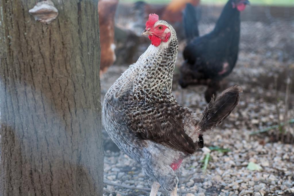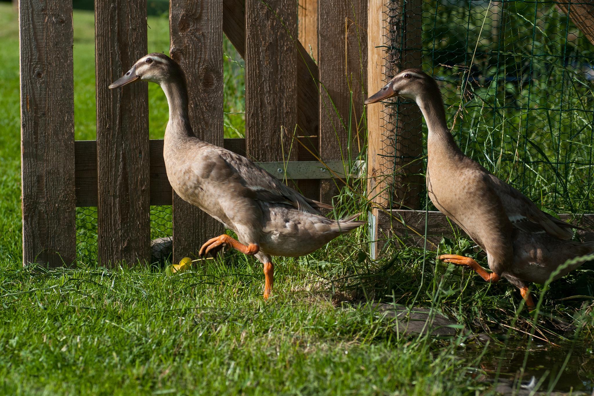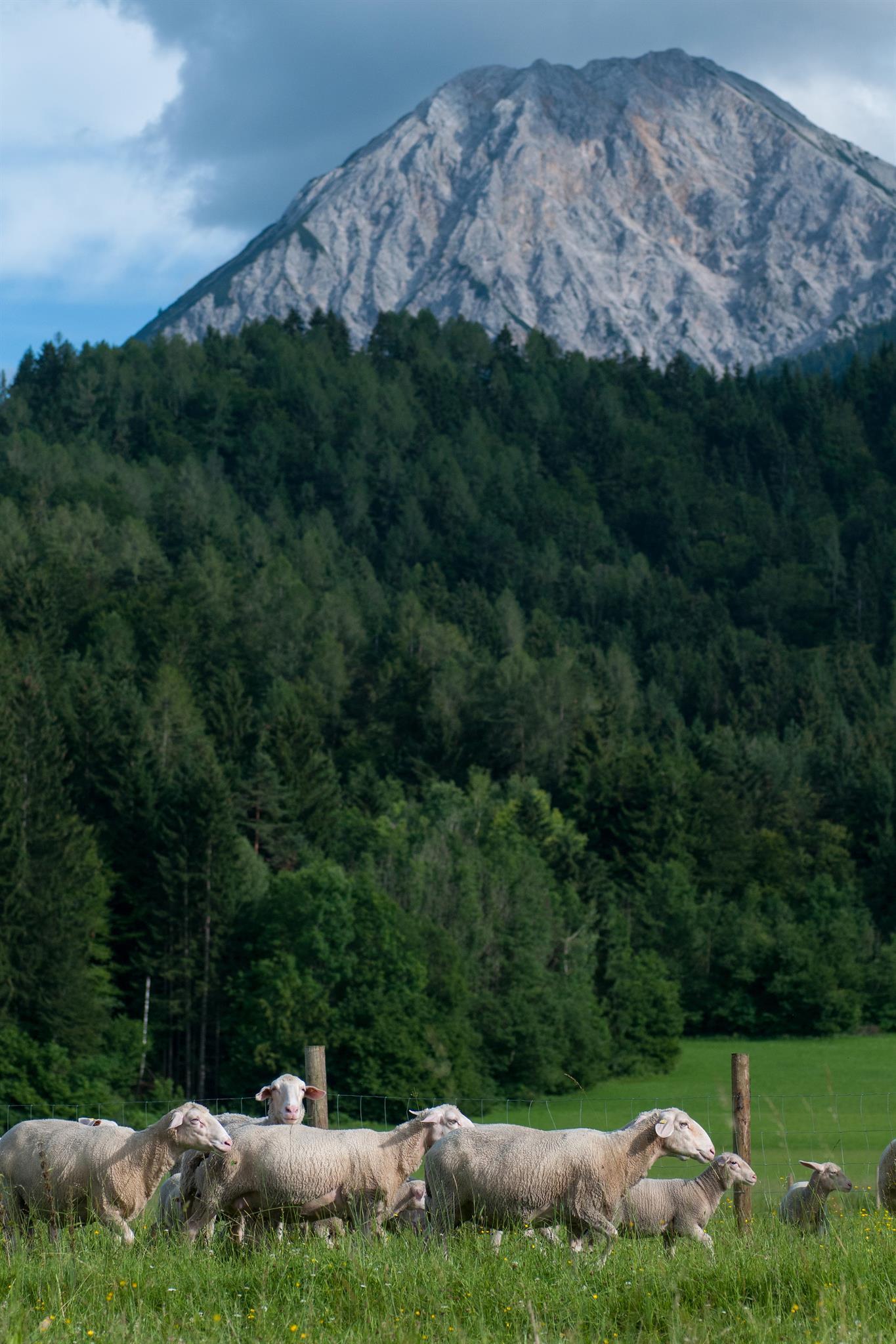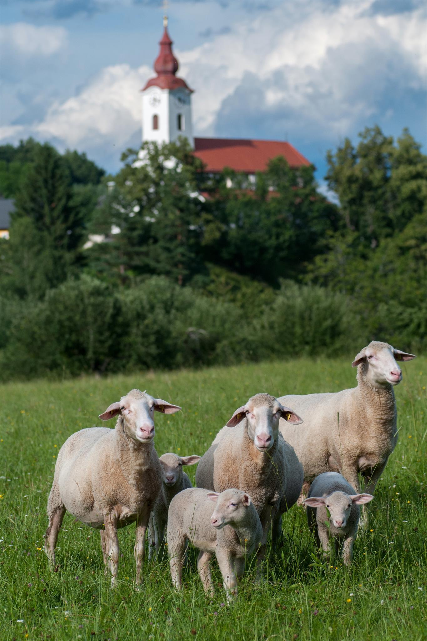 Willkommen an unserem Bio–Bauernhof mit Schafen und Kleintieren an einem Platz in der Sonne.