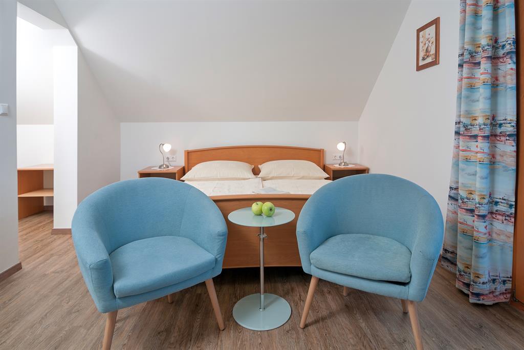 ein Doppelzimmer mit Dusche/WC, begehbaren Schrank und integriertem Wohnbereich,