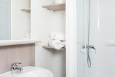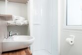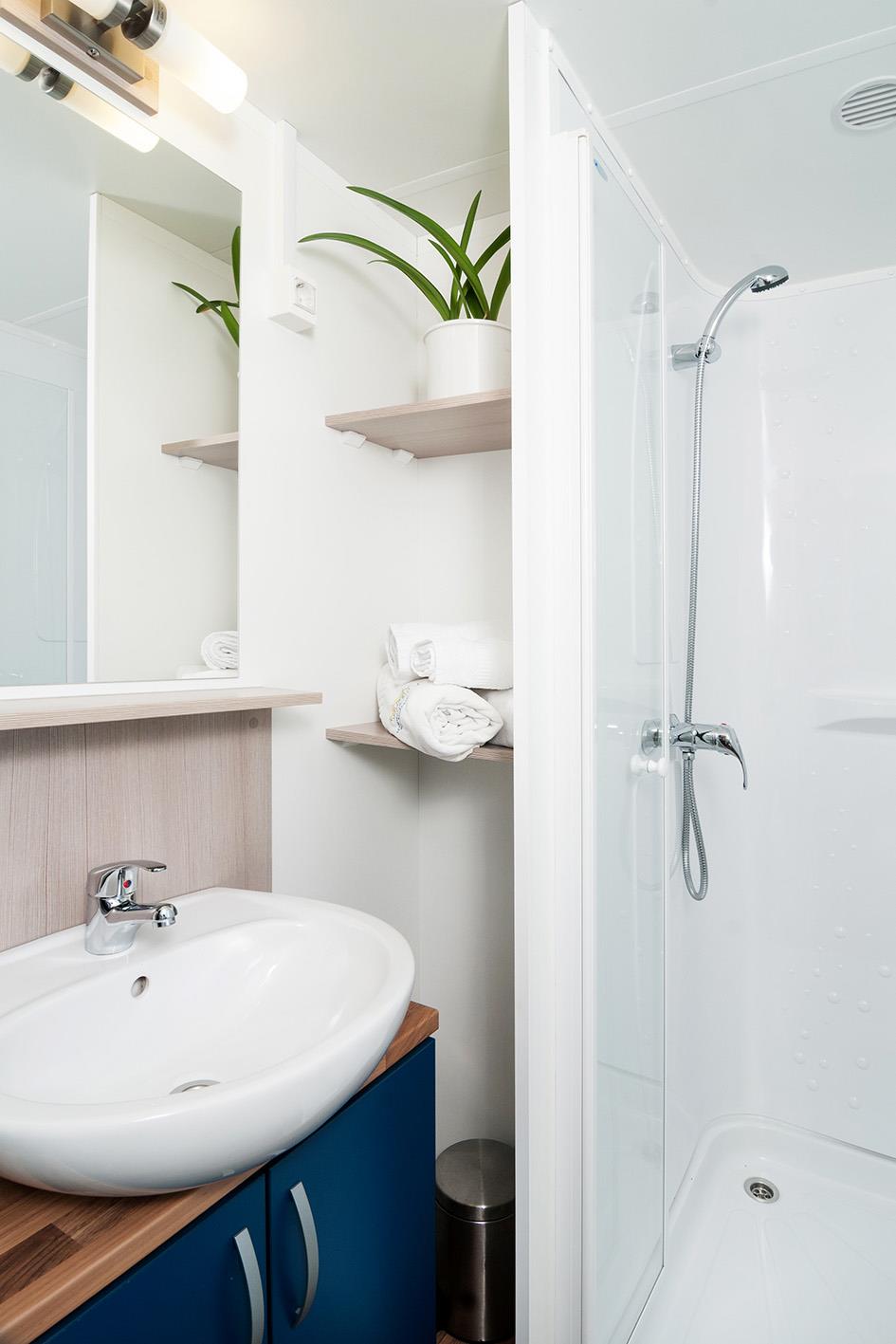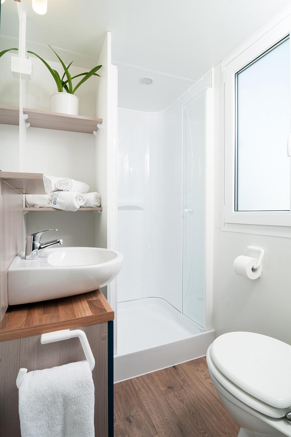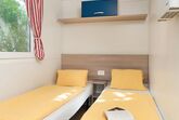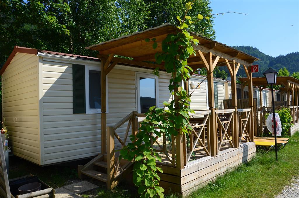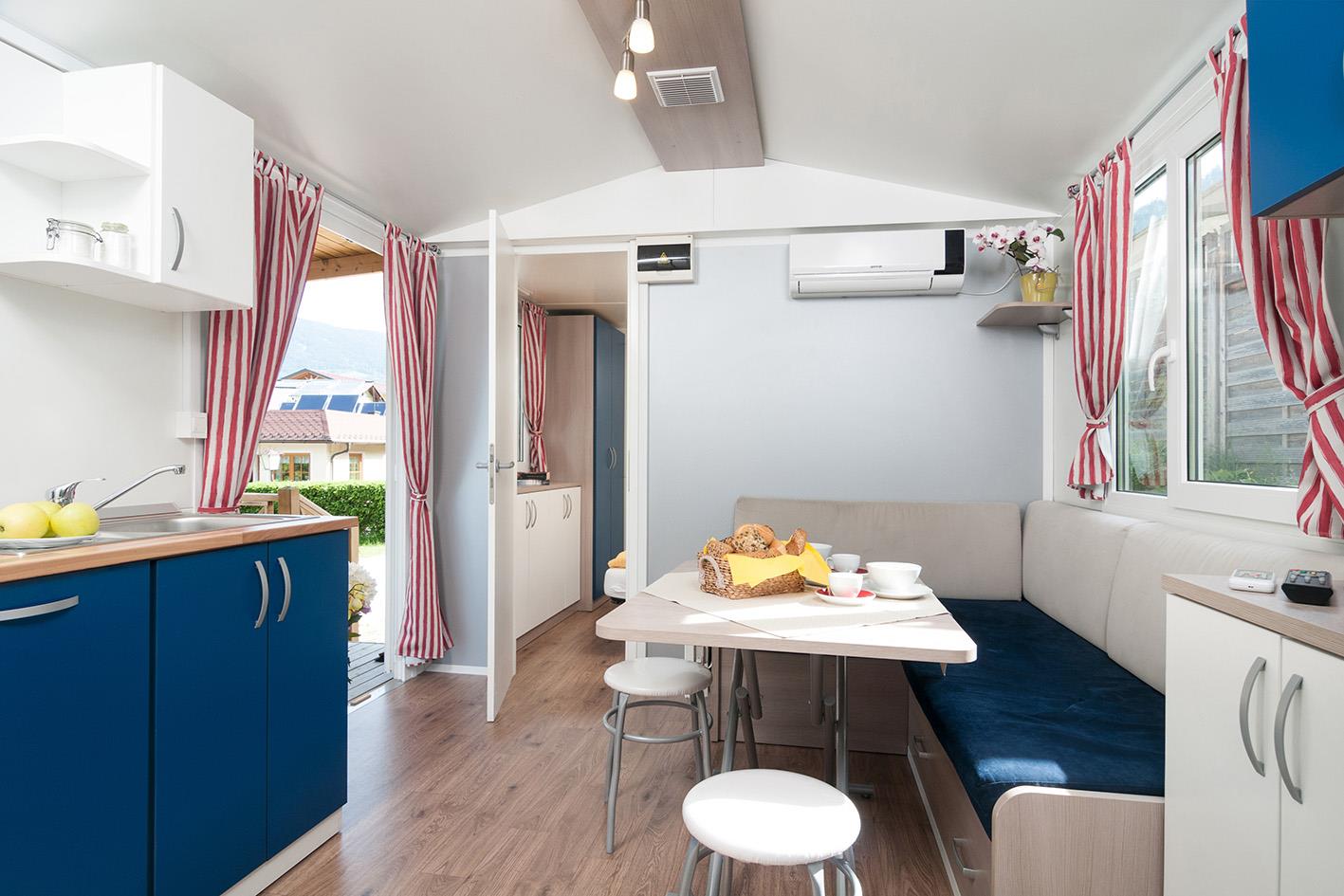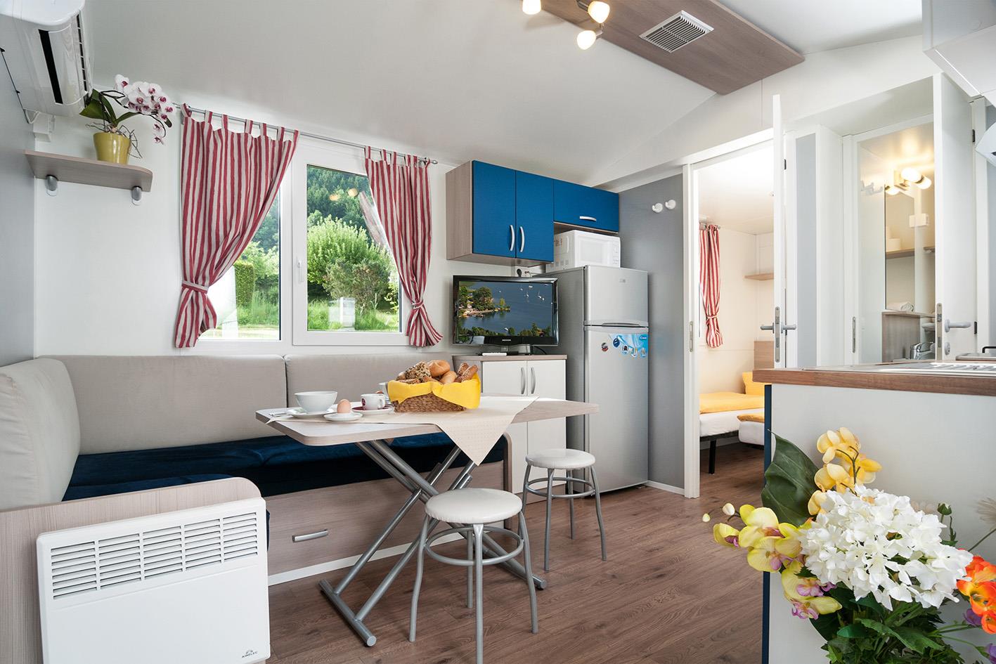 Ausstattung der Mobil Heime: Ein Schlafzimmer mit Ehebett. Ein separates Schlafzimmer für 2 bis 3 Kinder (Personen). Badezimmer mit Dusche und Waschbecken. WC. Im Wohnzimmer ausziehbares Doppelbett für 2 weitere Personen Maximalbelegung 6 - 7 Personen, je nach Typ. Mikrowelle, Gasherd, Kühlschrank, Dunstabzug, Abwasch, Geschirrspüler, Sitzecke, Klimaanlage, TV, Überdachte Terrasse mit Tisch und Stühle. Inkl. Bettwäsche, Geschirr und Porzellan. Wellness Eintritt, Liegestüle und WLan inklusive