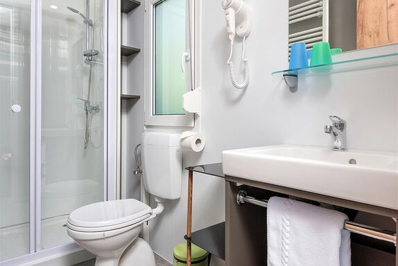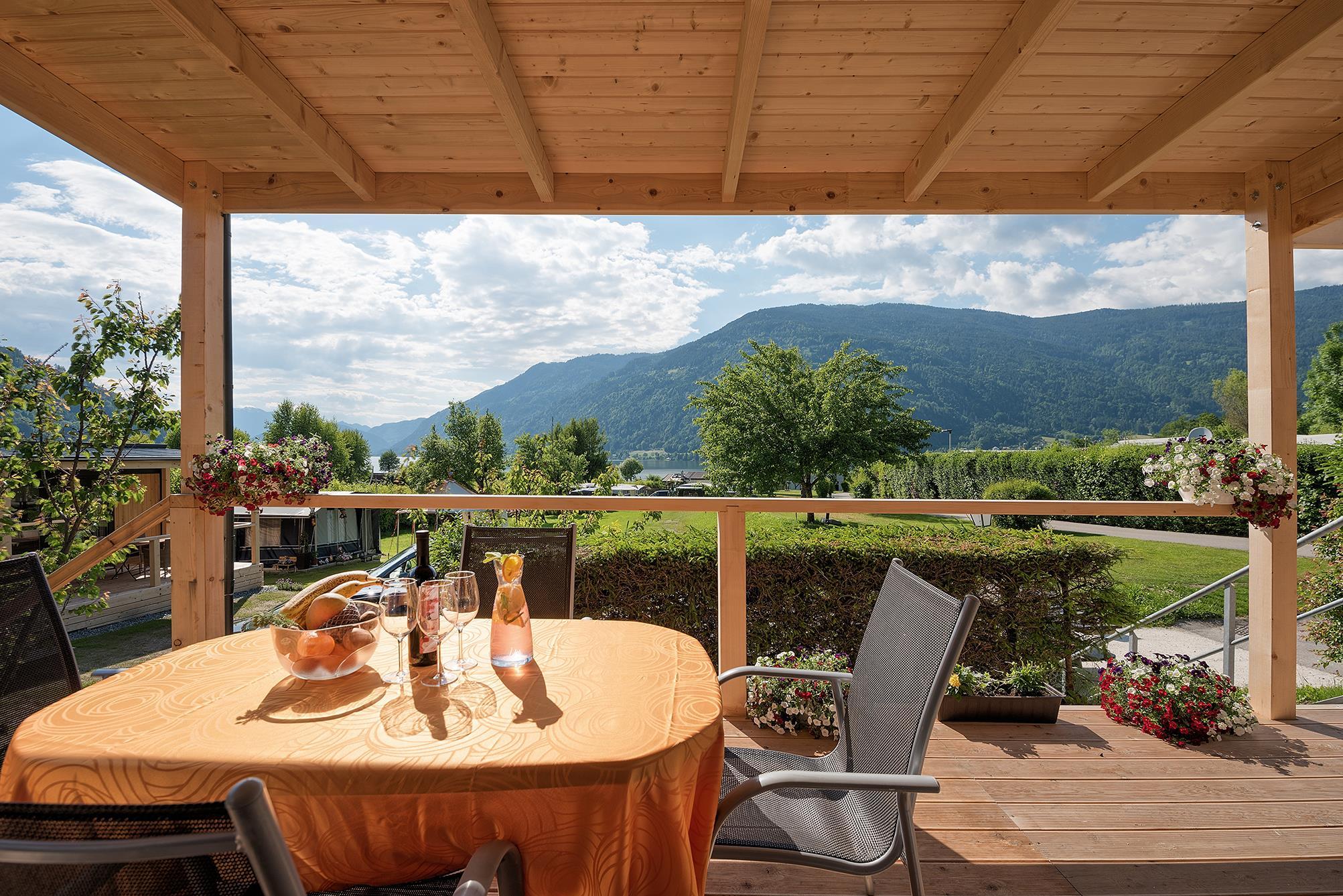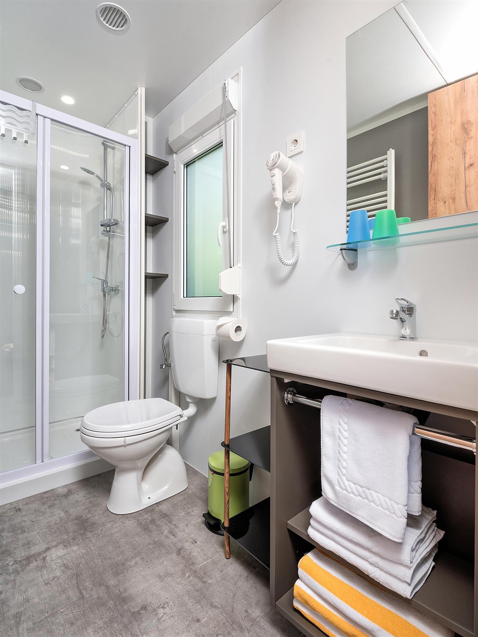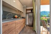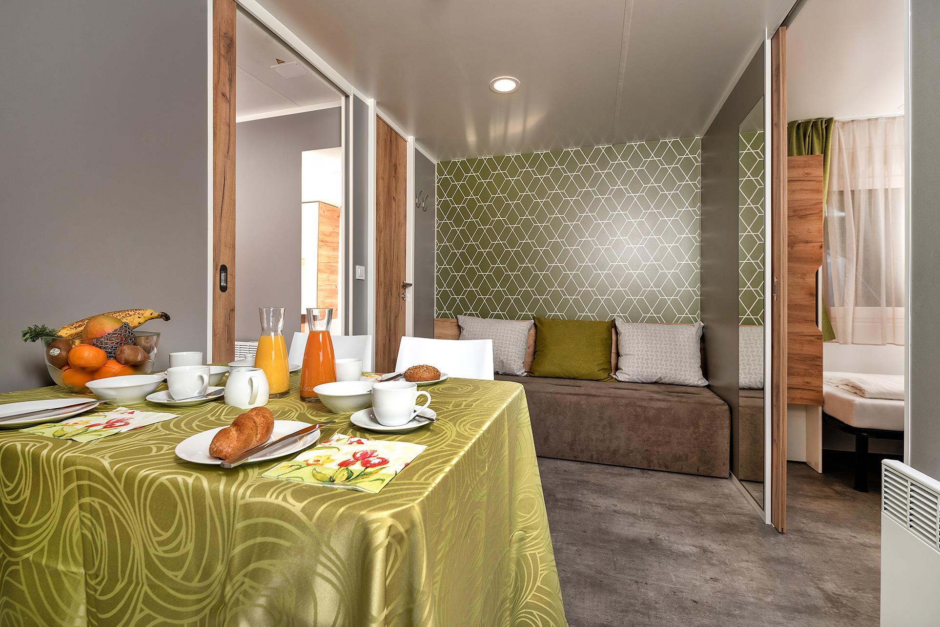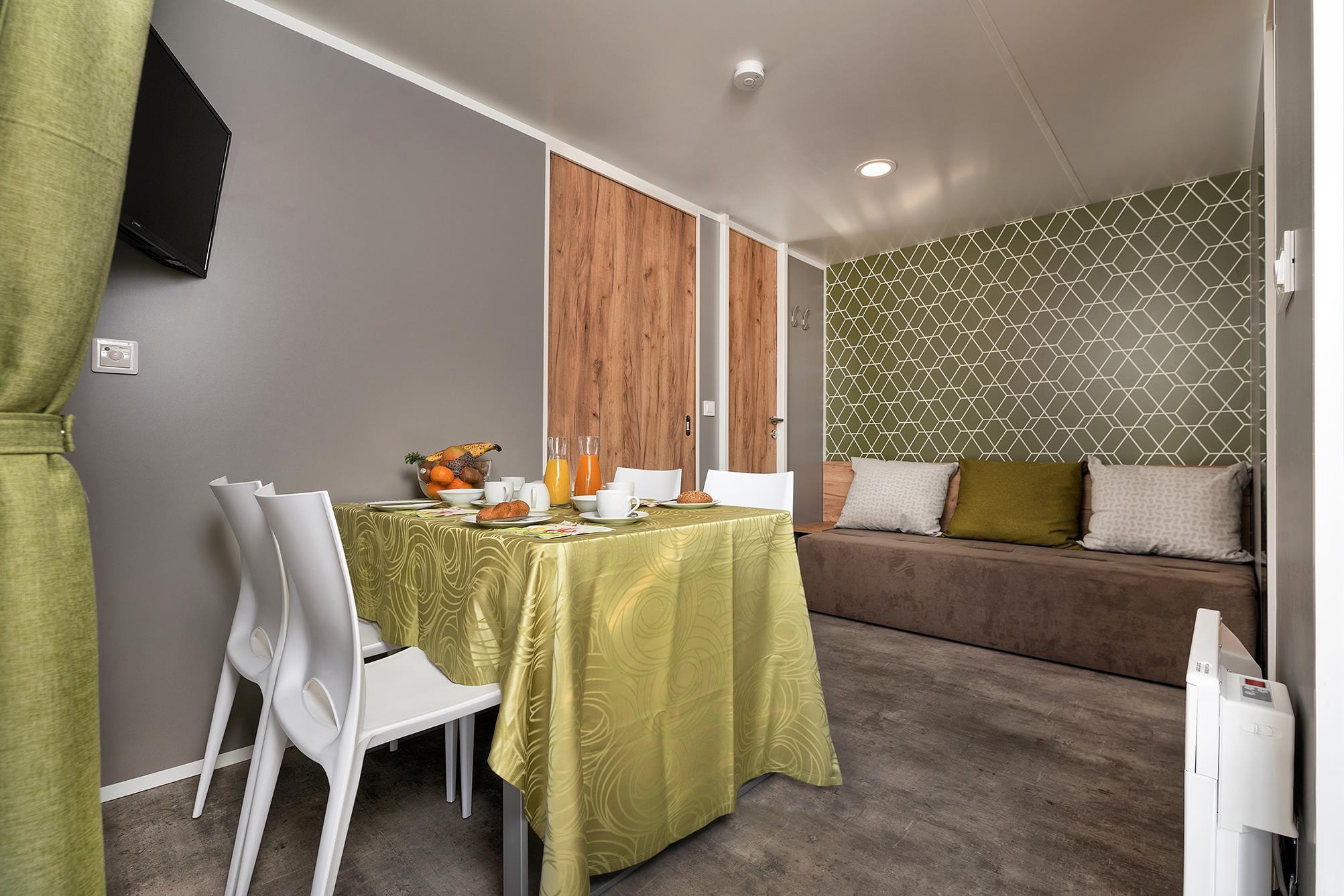 Ausstattung der Mobil Heime: Ein Schlafzimmer mit Ehebett. Ein separates Schlafzimmer für 2 Kinder oder Erwachsene. Badezimmer mit Bodenheizung, Dusche, WC und Waschbecken. Im Wohnzimmer ausziehbares Flafsofa für eine Person. Maximalbelegung 5 Personen. Küche mit Mikrowelle, Elektroherd Ceran, Kühlschrank mit Tiefkühlfach, Dunstabzug, Abwasch, Geschirrspüler, Sitzecke, Klimaanlage, TV, Überdachte Terrasse mit Tisch und Stühle. Inkl. Bettwäsche, Geschirr und Porzellan.