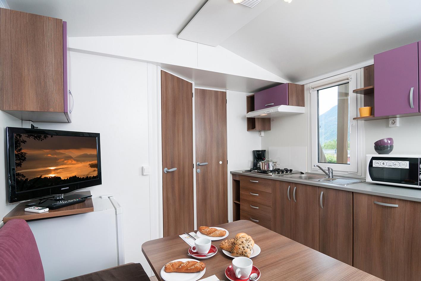 Ausstattung der Mobil Heime: Ein Schlafzimmer mit Ehebett. Ein separates Schlafzimmer für 2 bis 3 Kinder (Personen). Badezimmer mit Dusche und Waschbecken. WC. Im Wohnzimmer ausziehbares Doppelbett für 2 weitere Personen Maximalbelegung 6 - 7 Personen, je nach Typ. Mikrowelle, Gasherd, Kühlschrank, Dunstabzug, Abwasch, Geschirrspüler, Sitzecke, Klimaanlage, TV, Überdachte Terrasse mit Tisch und Stühle. Inkl. Bettwäsche, Geschirr und Porzellan. Wellness Eintritt, Liegestüle und WLan inklusive