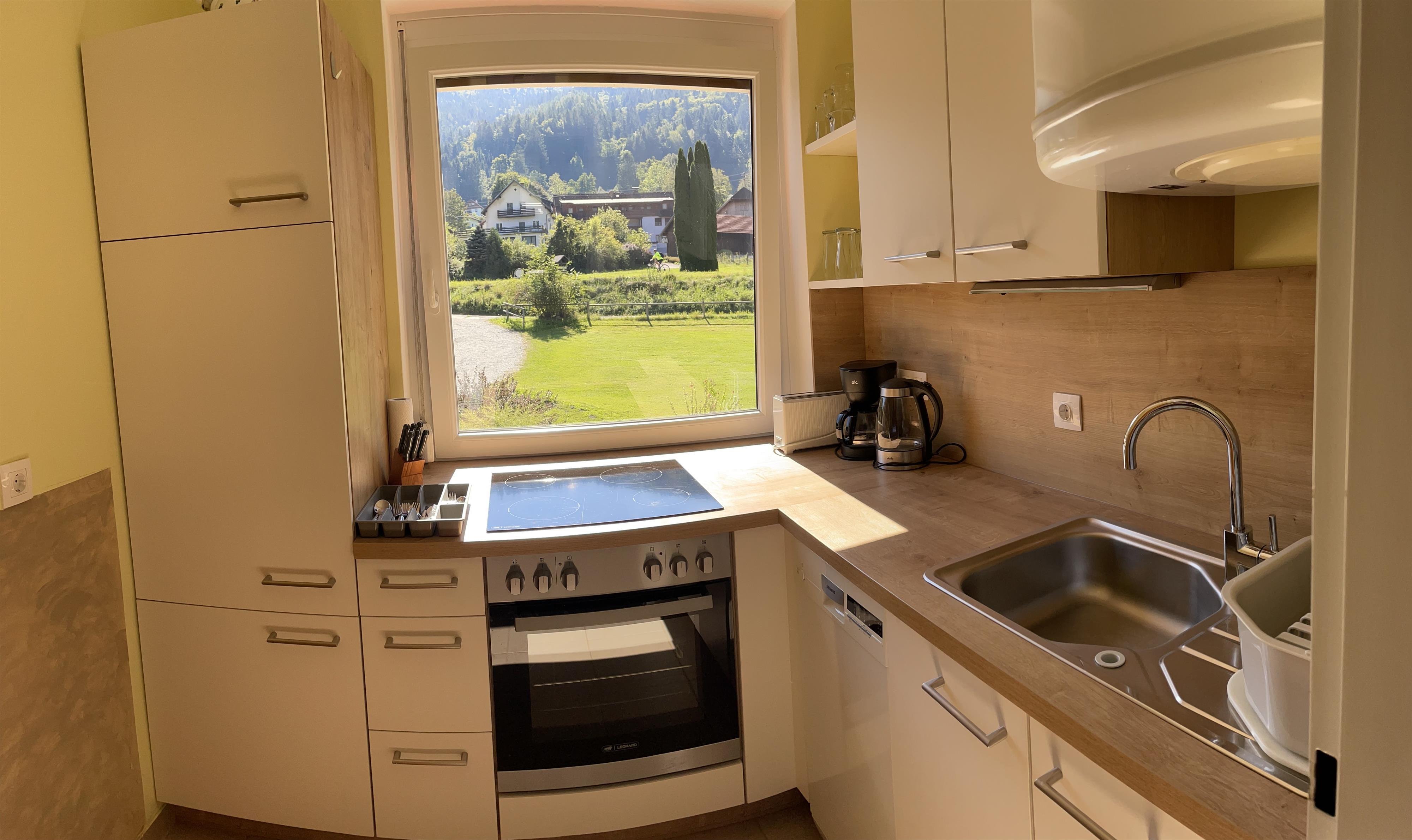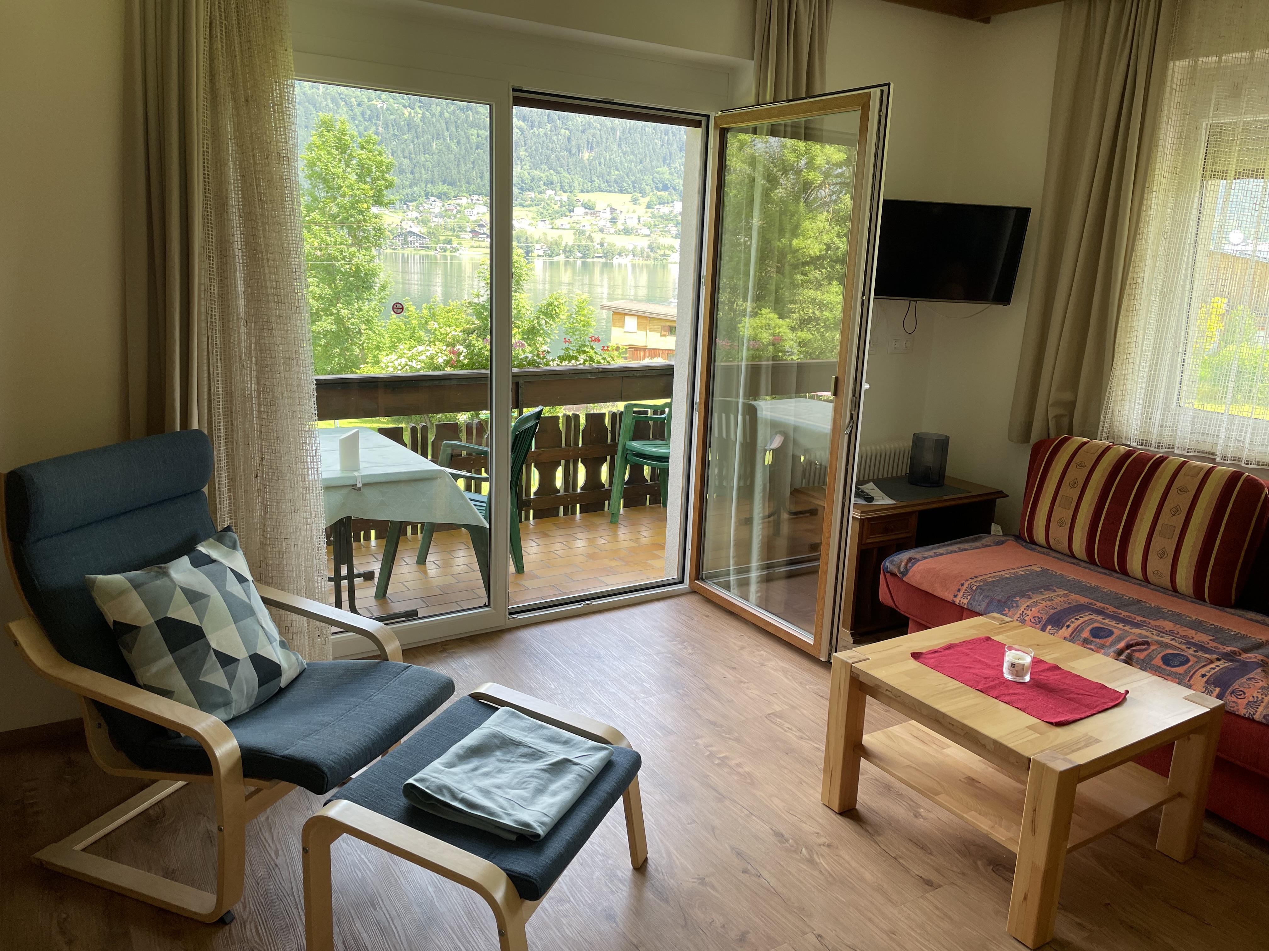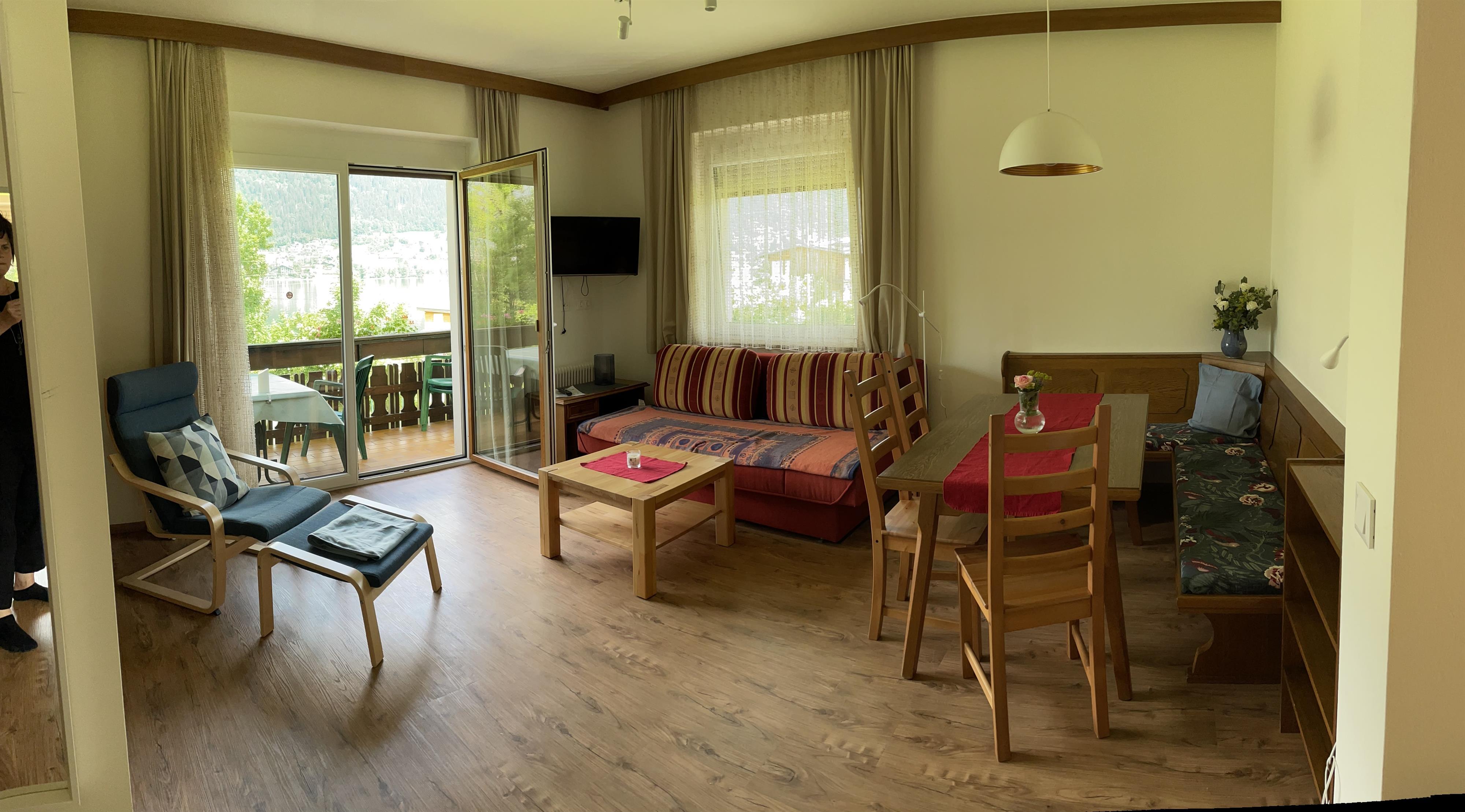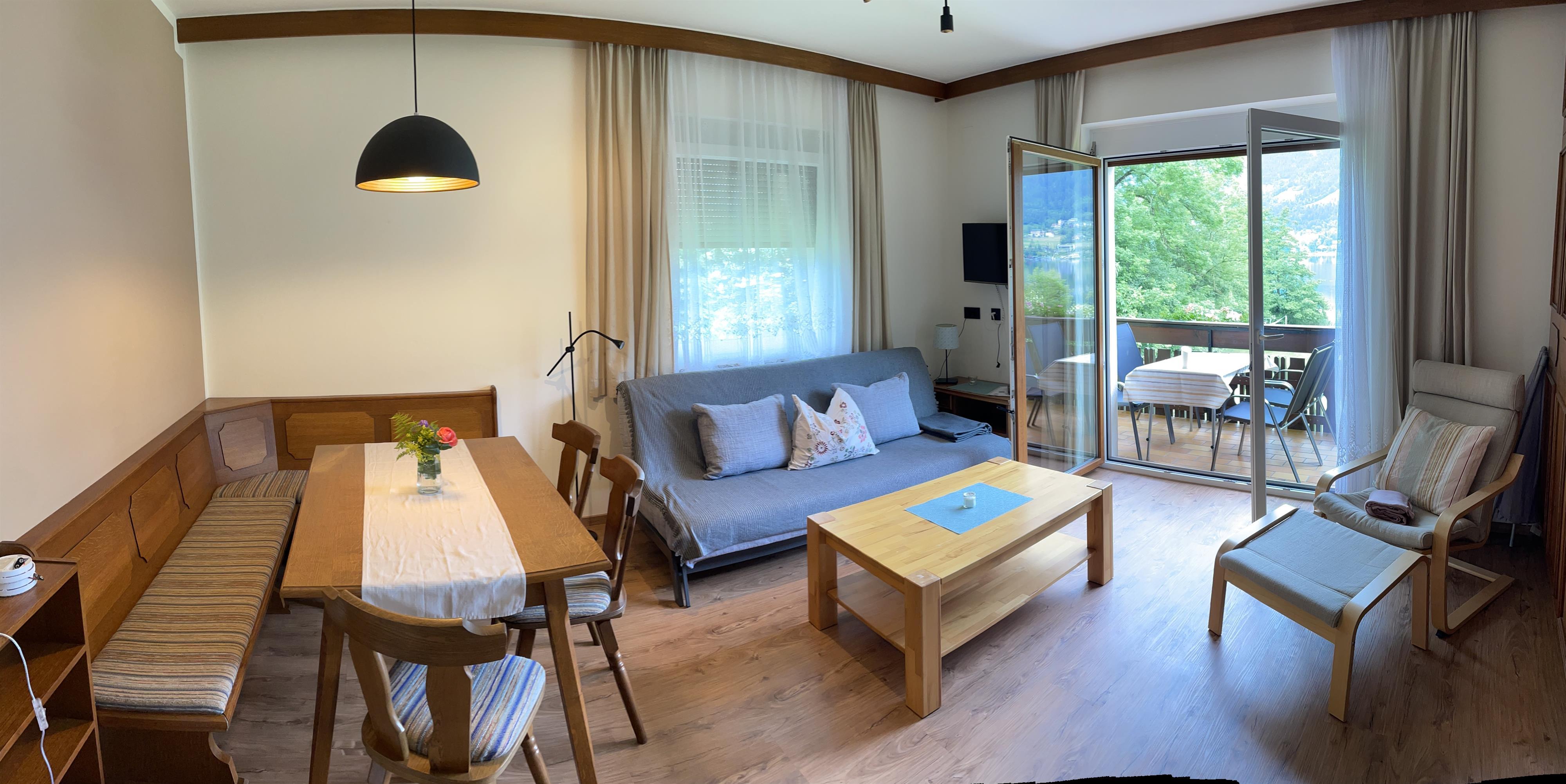 Die Ferienwohnung verfügt über ein Wohnzimmer mit integriertem Essbereich/Schlafcouch, zwei getrennte Schlafzimmer, eine vollständig ausgestattete Küche (inklusive Geschirrspüler), Bad/Dusche/getrenntes WC sowie einen seeseitigen Balkon mit herrlichem Blick auf den Ossiachersee.