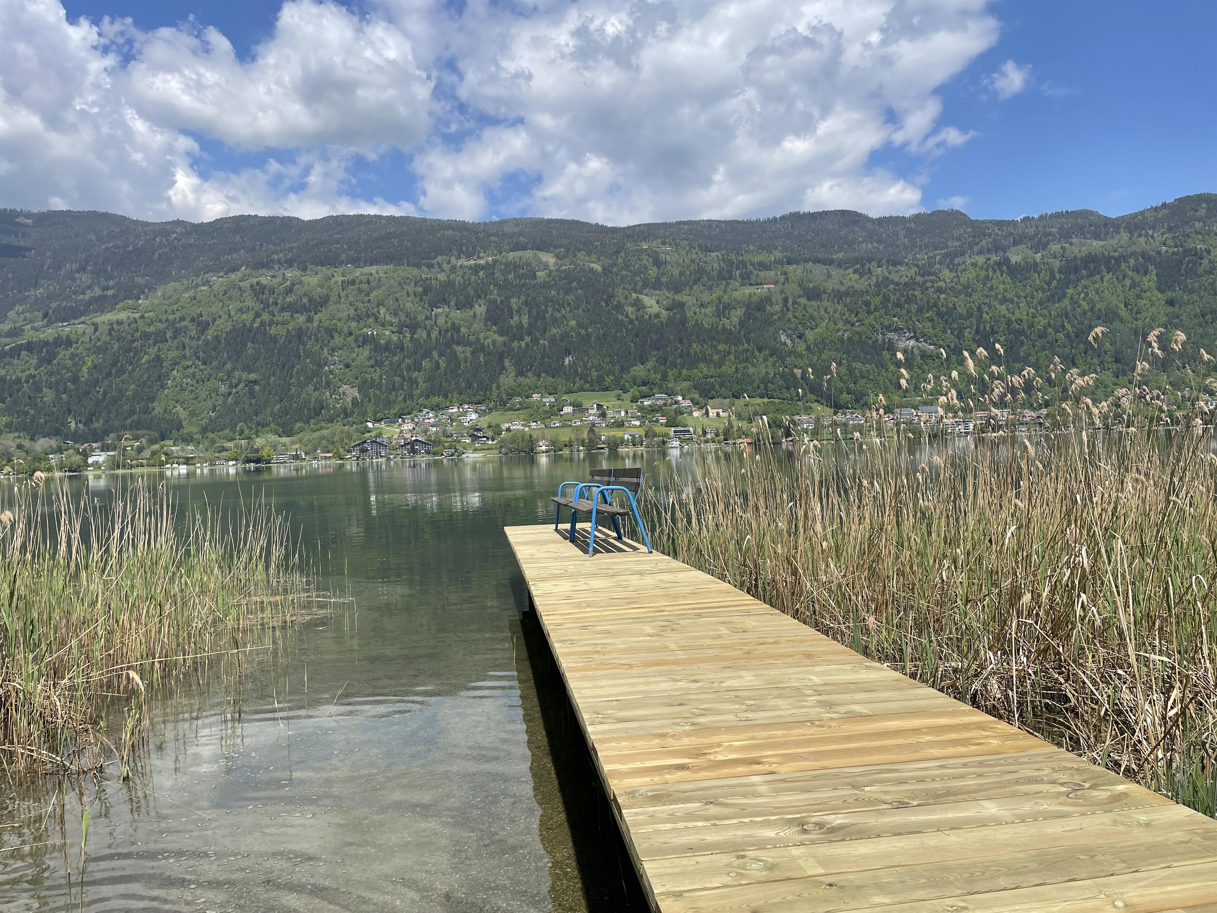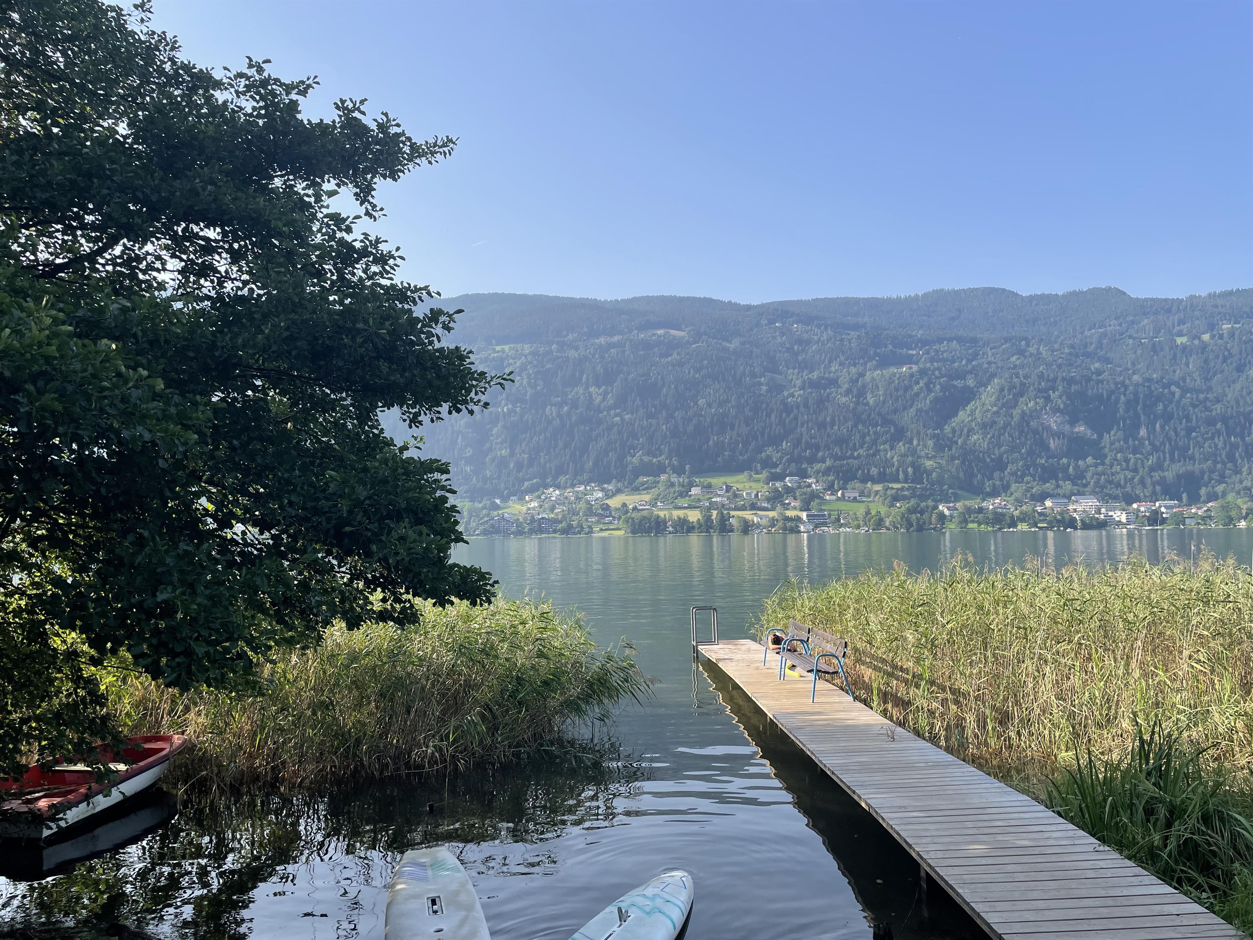 Vom Appartement wenige Schritte und unser eigener Badestrand mit kinderfreundlich verlaufendem Seeufer und Badesteg lädt zum Sprung ins kühle Nass.