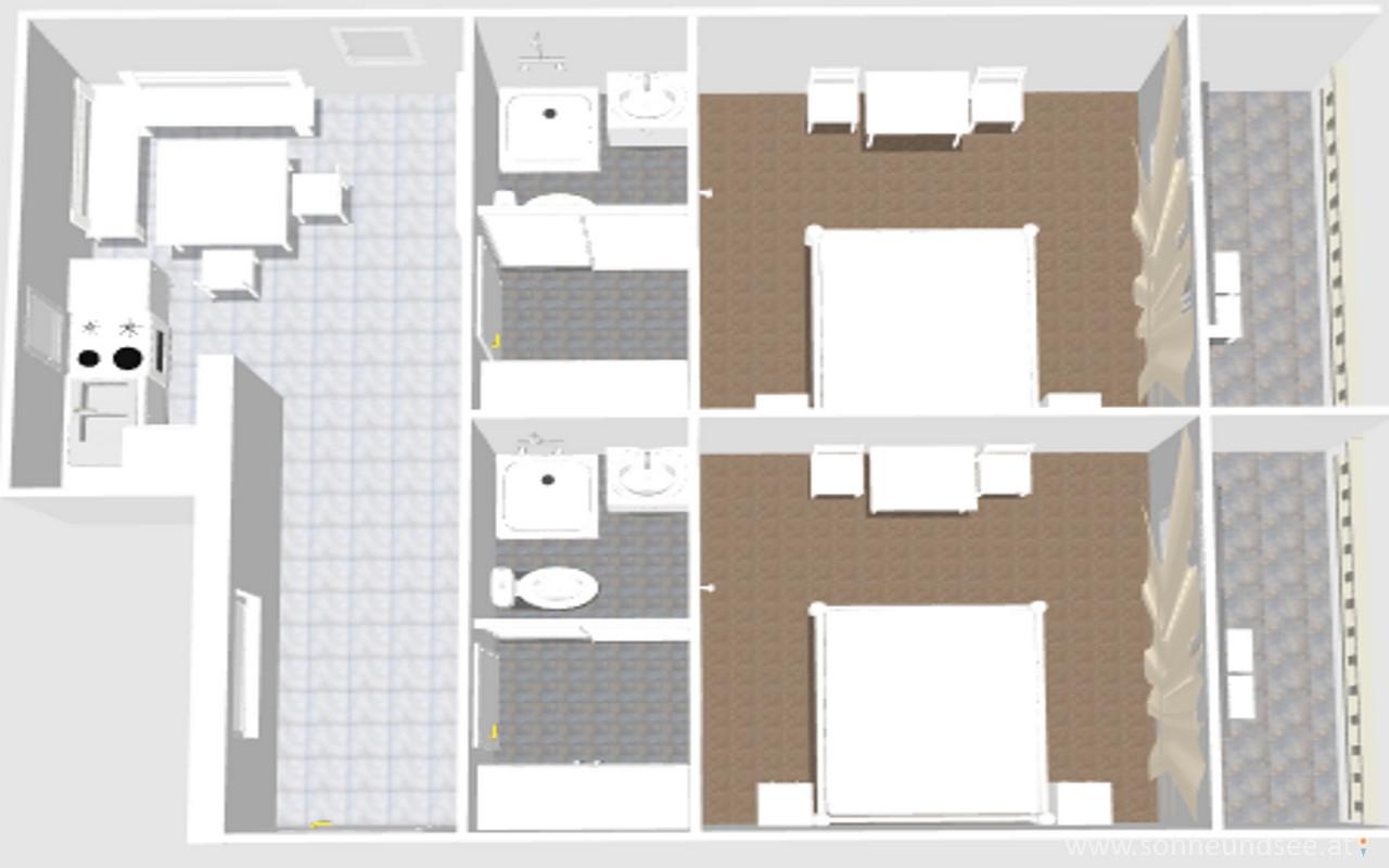 Zwei renovierte Appartements (Fewo) für 2 Personen eines im Parterre und das zweite im 1.Stock – Küche, Zimmer mit Doppelbett, Dusche, WC, Terrasse, bzw. Balkon. Bettwäsche, Tischwäsche, Handtücher, Flachbild-TV, SAT, Fön, Espressomaschine. Appartements mit Kühlschrank, Geschirrspüler und Geschirr. Selbstversorger.