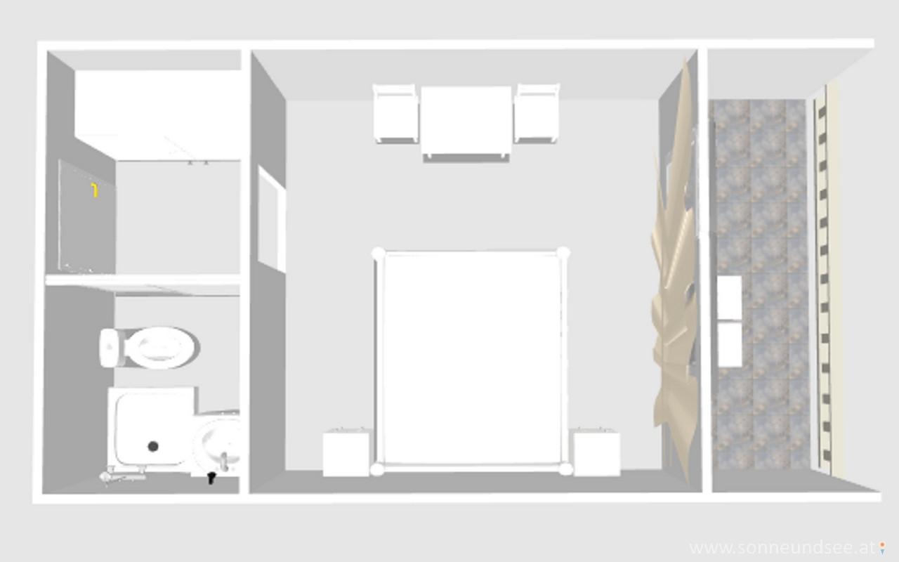Aufteilung: Schlafzimmer, Bad (Dusche & WC), Balkon.