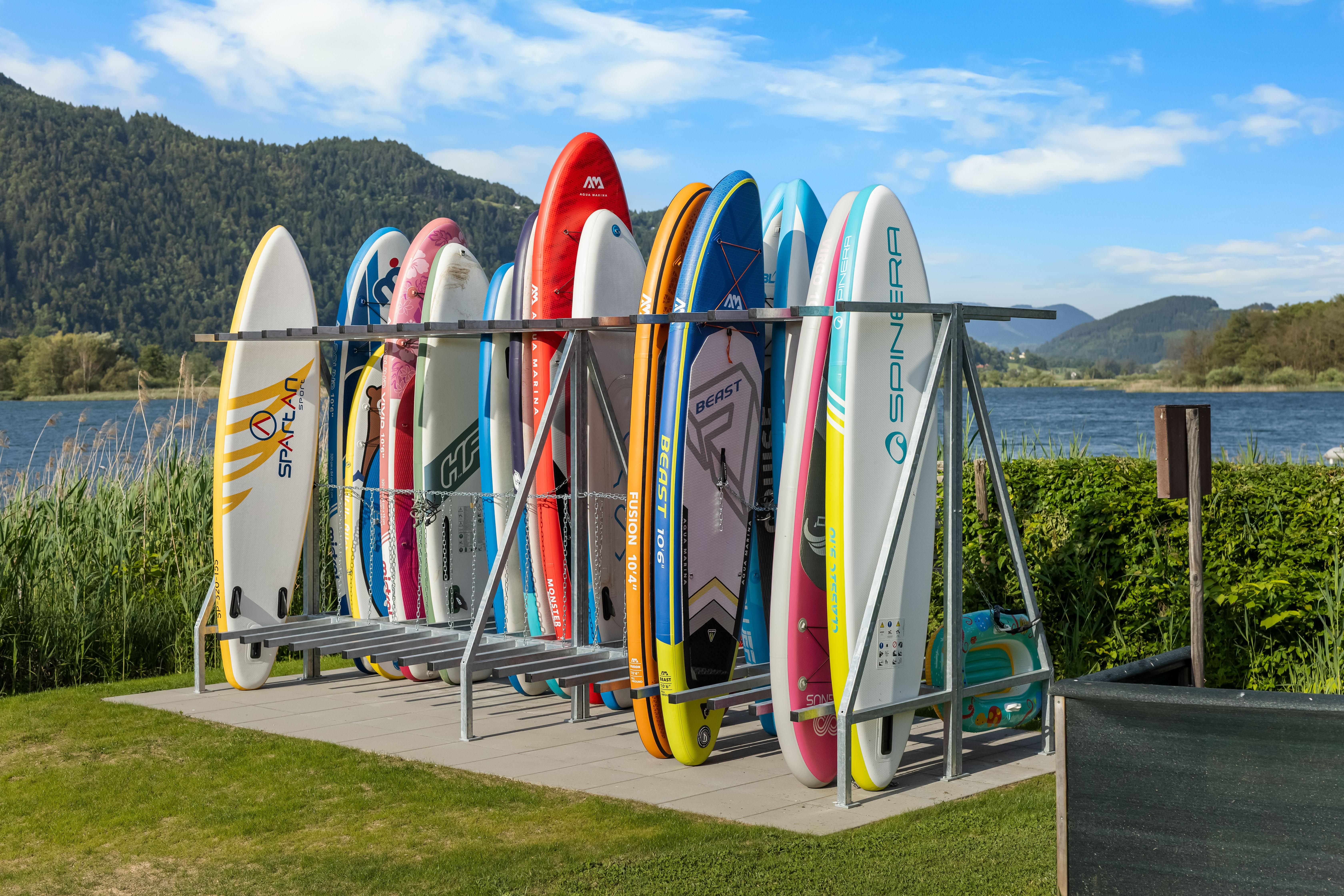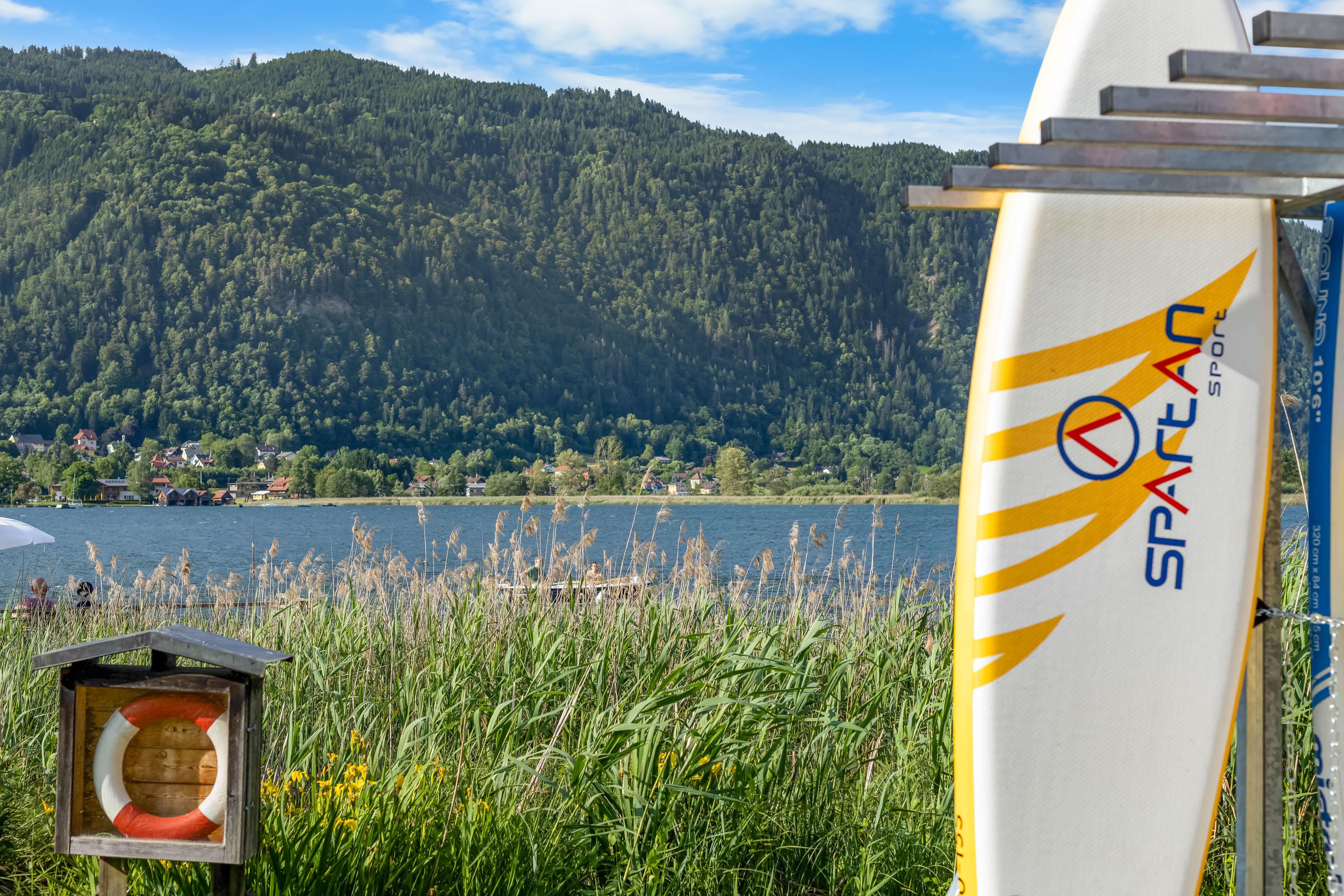 Beim Haus befindet sich eine sonnige Sitzterrasse, Liegewiese mit herrlichem Ausblick auf den See. Badestrand mit Umkleidekabinen, WC, Duschanlagen und Surfbrett-, und Bootsanlegeplatz.