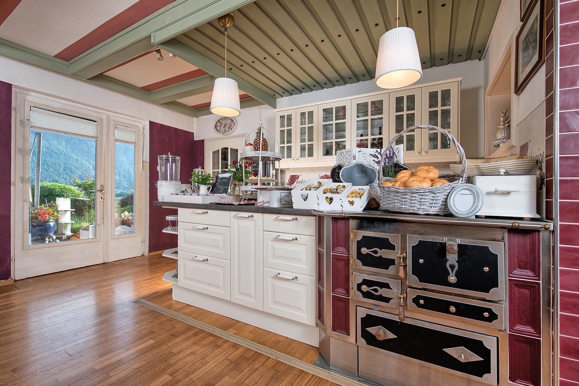 Zum Frühstück reichen wir ein Frühstücksbuffet im romantischen Frühstücksraum oder auf der Terrasse.