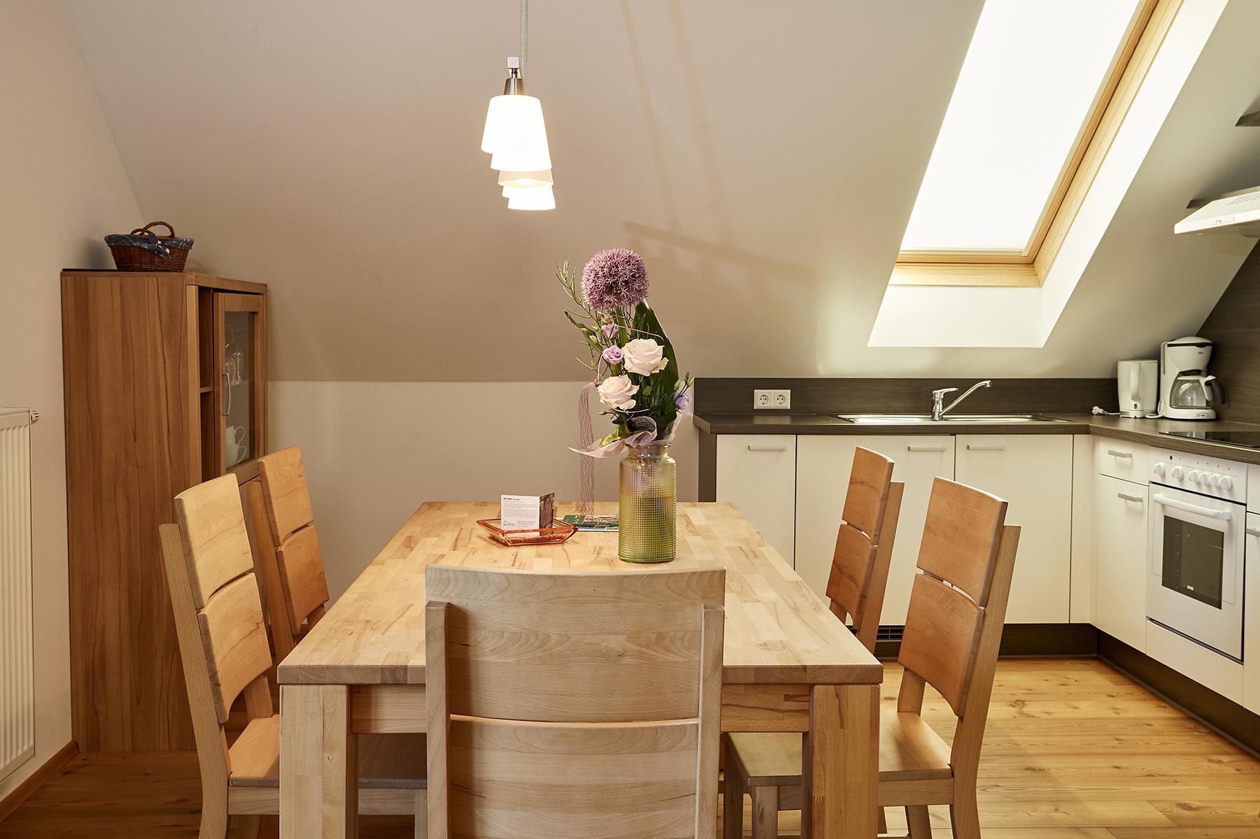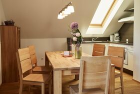 Desweiteren befindet sich ein Schlafzimmer für 2 Personen, sowie eine separate Dusche und WC in der Ferienwohnung. Die Einrichtung ist aus Holz, wodurch ein angenehmens Wohlgefühl entsteht.