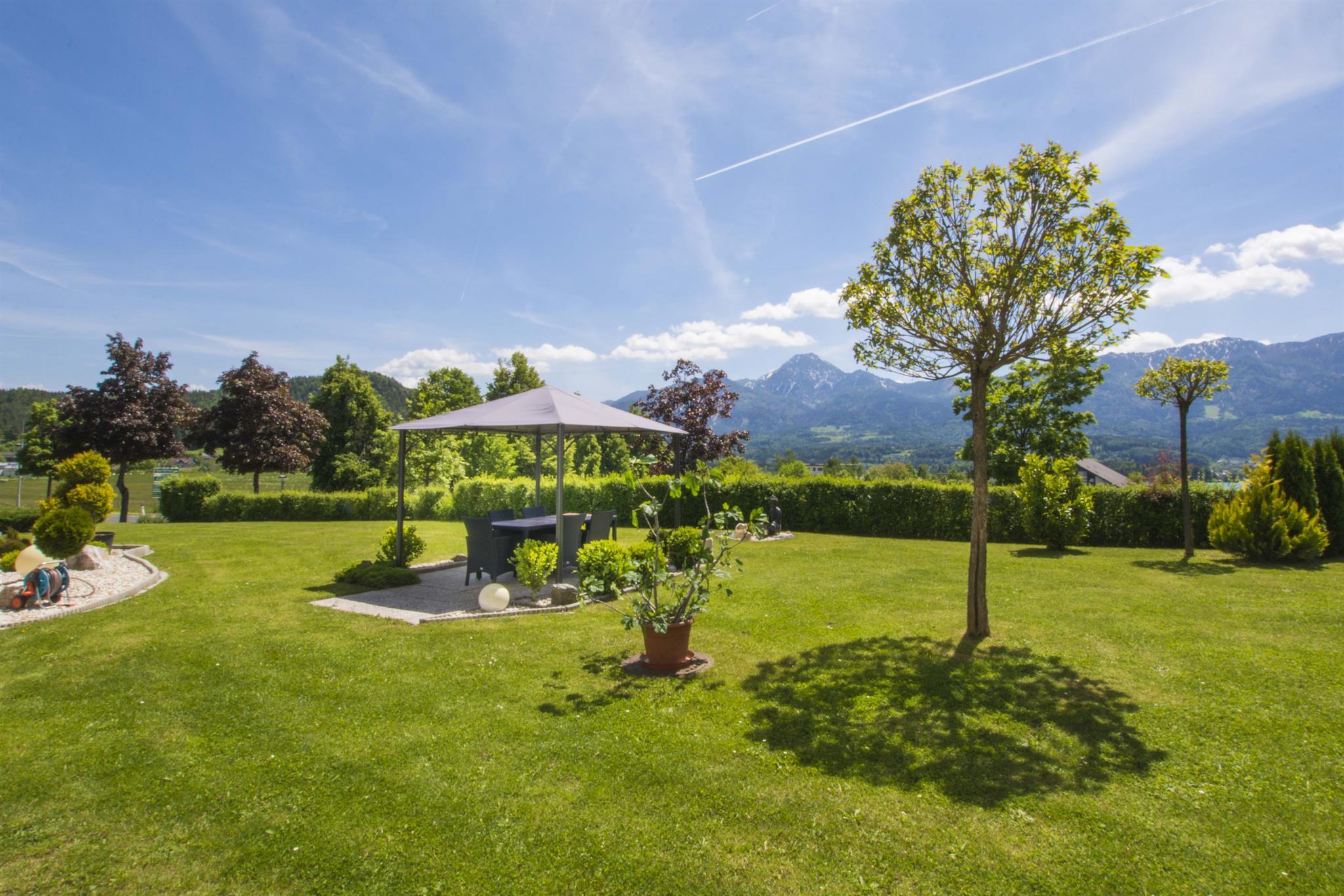 Unser Haus liegt auf einer Erhebung mit einem wunderschönen Rundblick. Südseitig mit Blick auf den Faaker See (ca. 8 Gehminuten) und die Karawanken.
