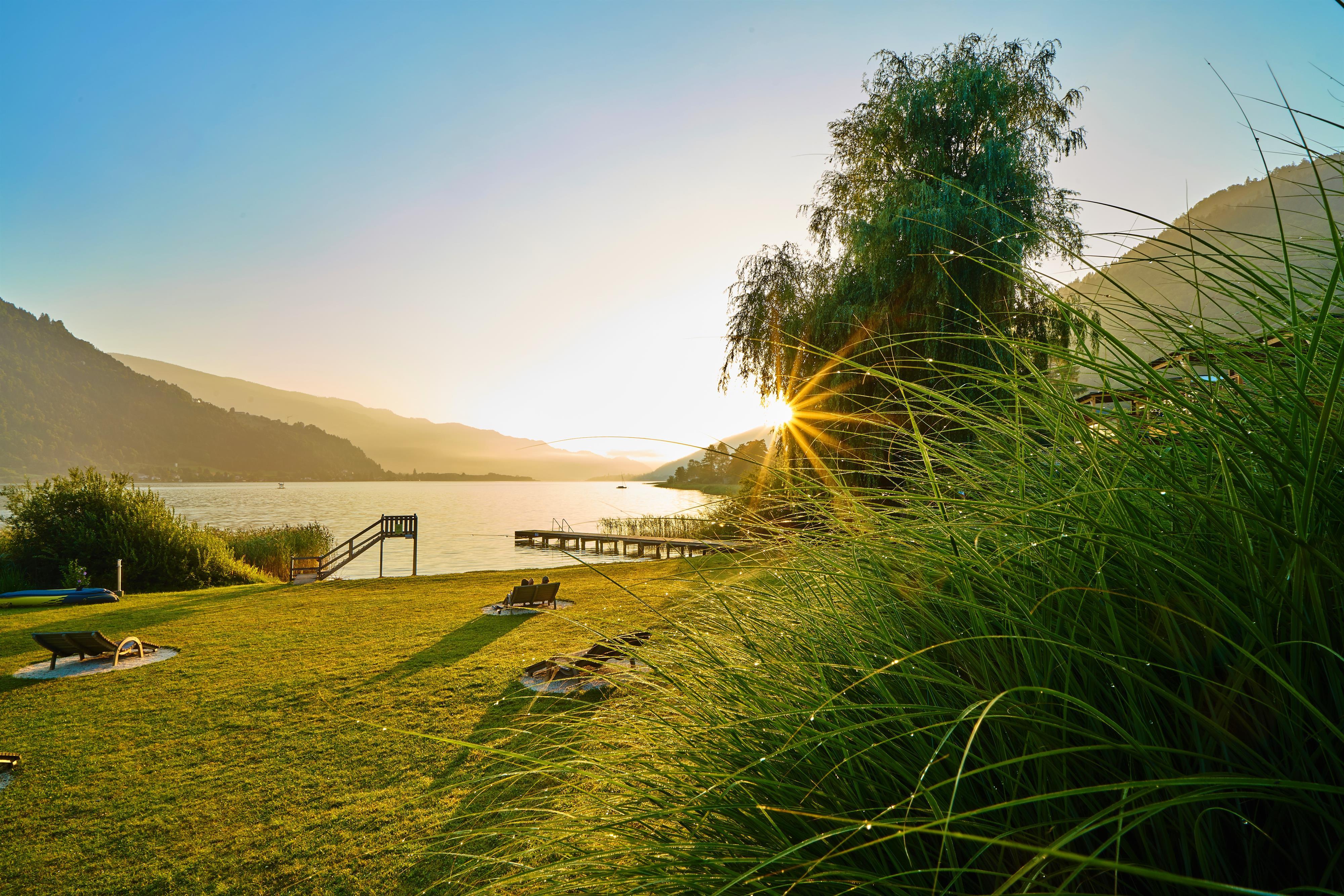 Der flache Badestrand mit schöner Liegewiese lädt zum Plantschen und Verweilen am See ein.