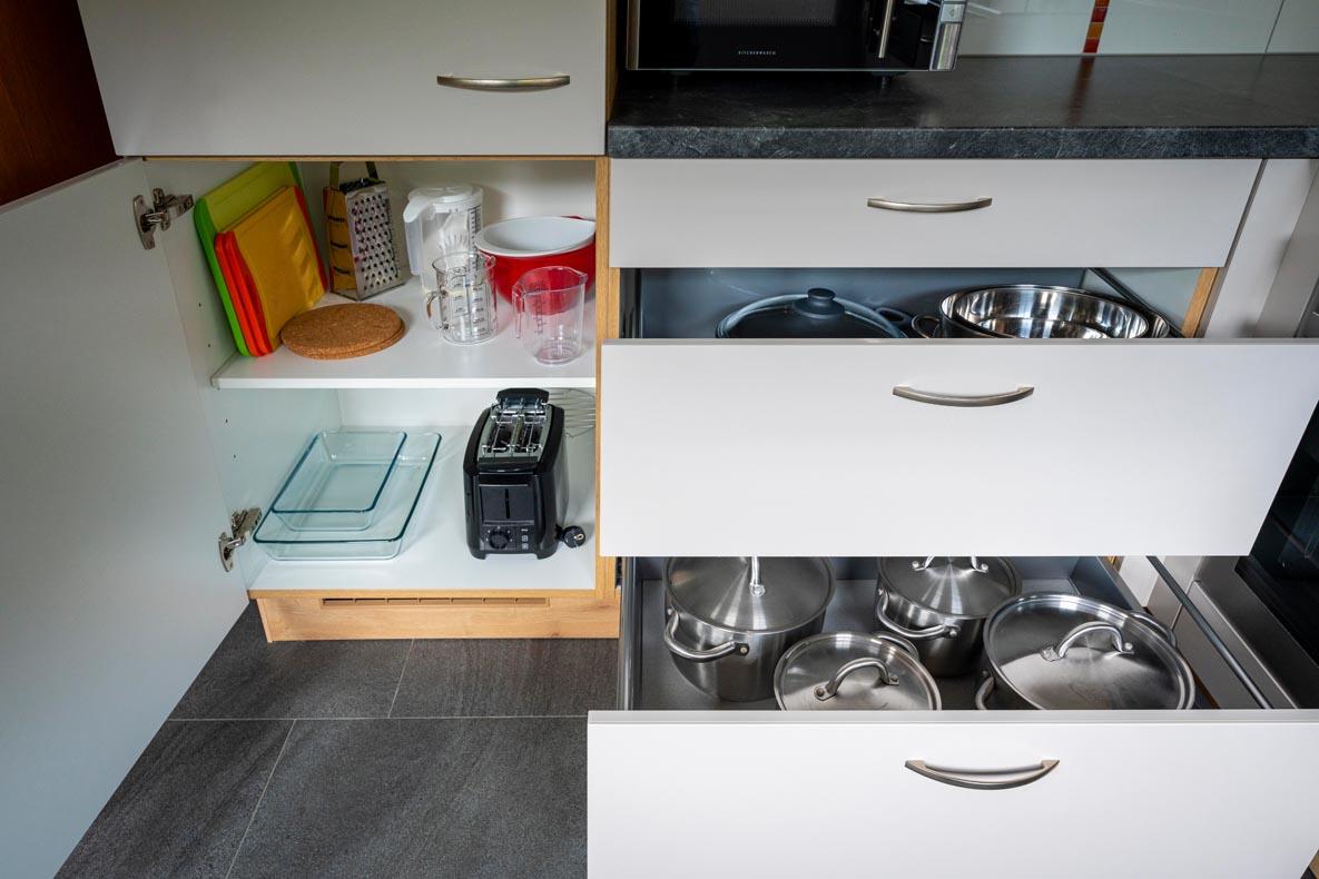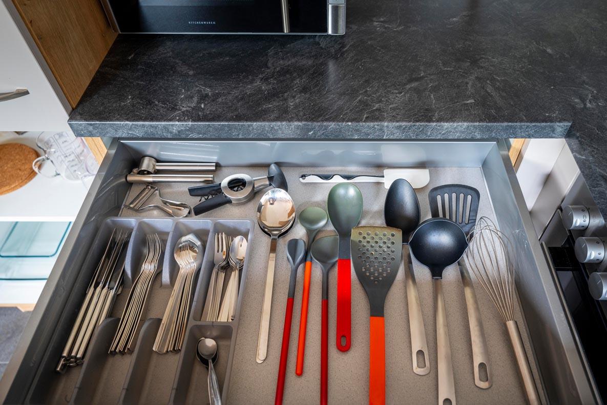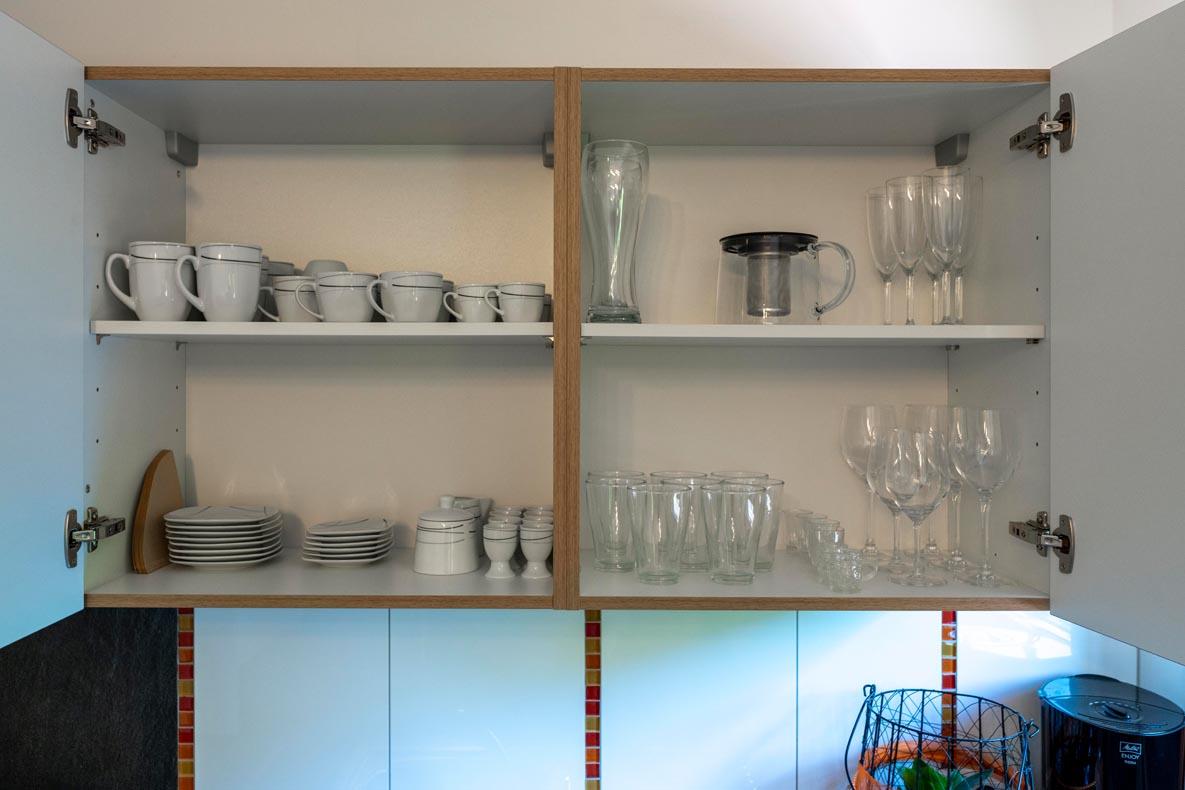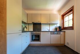 • Vollausgestattete Küche (Geschirrspüler, Kühlschrank mit Gefrierfach, Mikrowelle, Kaffeemaschine, Wasserkocher, Toaster, Geschirr, Tücher und Reinigungsmittel) mit Essecke