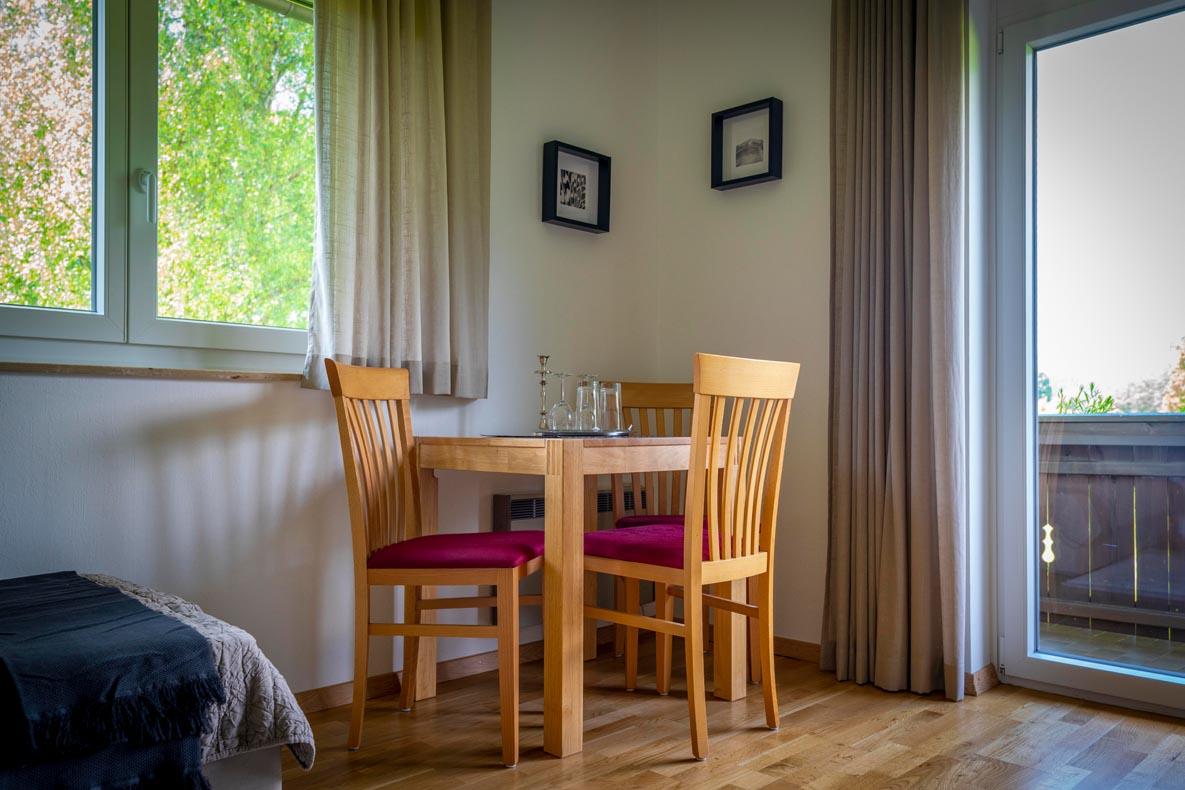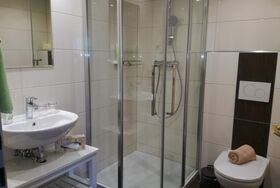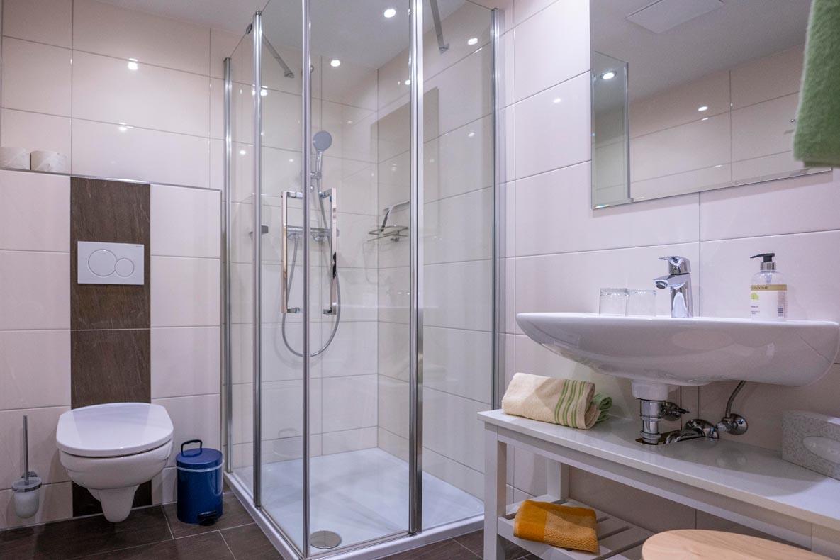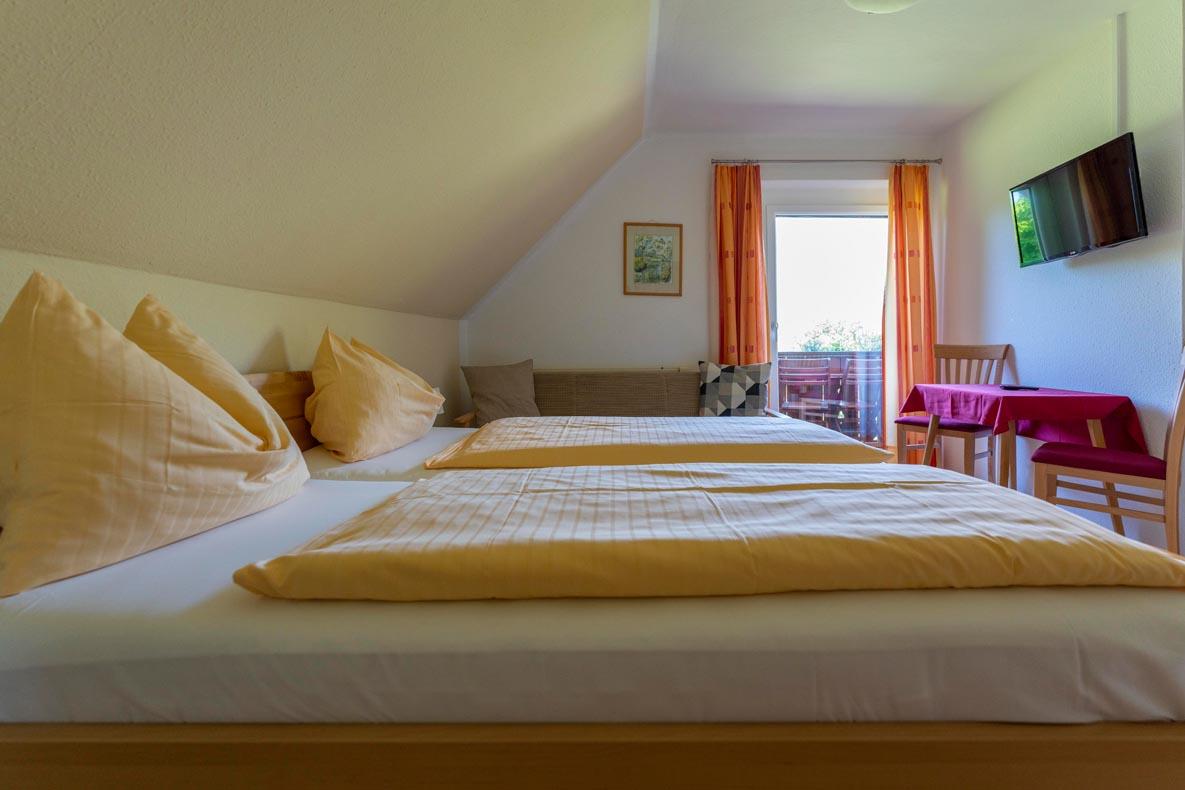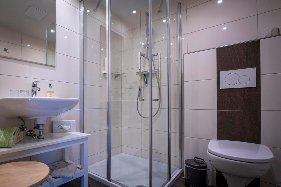 Alle Zimmer mit Dusche und WC, Sat-TV, Heizung und Balkon. Gemeinschaftskühlschrank, geräumiger Aufenthaltsraum, Sitzgarten und Spielwiese. Parkplätze beim Haus.