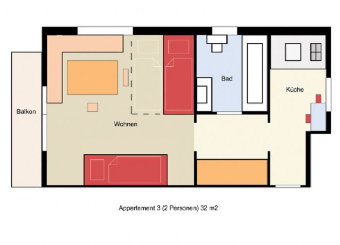 Gemütliche Ferienwohnung für zwei Personen. Wohnschlafraum mit Bad/WC und separater Küche. Balkon, Kabel-TV, Telefon, W-Lan. Nichtraucher Appartement. Täglicher Brötchenservice direkt an die Zimmertüre. Sie können auch gerne bei uns frühstücken, Aufpreis EUR 12.- pro Person, Kinder EUR 7.-