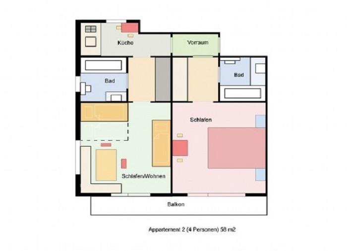 Das Appartement für 4 Personen besteht aus einem Doppelzimmer mit Bad/WC, einem Wohnschlafraum mit eigenem Bad/WC, separater Küche. Balkon, Kabel- TV, Telefon, freier Internetzugang( W-Lan). Nicht-Raucher Appartement. Täglicher Brötchenservice direkt an die Zimmertüre. Sie können auch gerne bei uns frühstücken, Aufpreis pro Frühstück EUR 12.- für Kinder EUR 7.- Pro Appartement steht ihnen ein Parkplatz zur Verfügung.