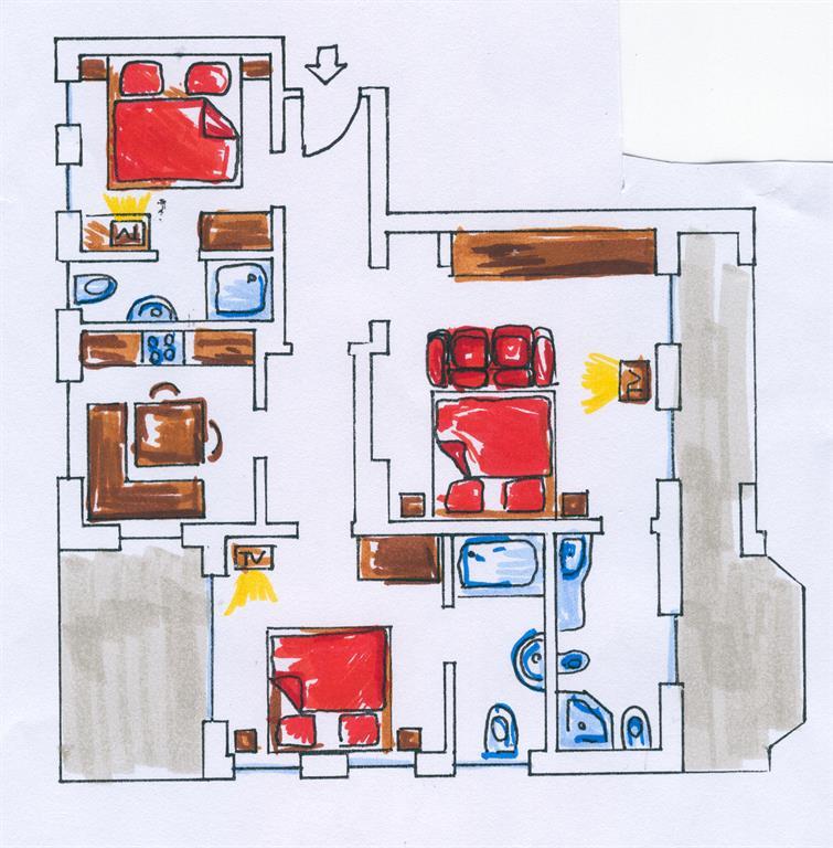 Das Appartement besteht aus 3 Doppelzimmern(ein Zimmer 3-bettig möglich). Jedes Zimmer hat eine eigene Dusche,WC, Flachbild-Sat-TV, kostenfreies W-Lan, Balkon. Küche mit Ceranfeld, Backrohr, Mikrowelle, Geschirrspüler, Kühlschrank mit Gefrierfach