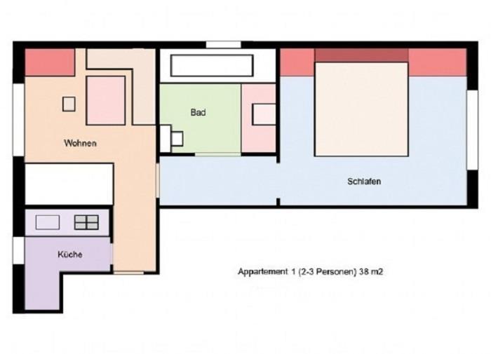 Gemütlich Ferienwohnung für 2 Personen. Auch mit einem Kind geeignet. Besteht aus einem Doppelzimmer mit Bad/WC, einem Wohnraum und separater Küche. Kabel-TV, Telefon, freier Internetzugang( W-Lan). Sie können gerne unseren öffentlichen Balkon benützen. Nichtraucher Appartement. Wir bieten ein tägliches Brötchenservice direkt an die Zimmertüre an. Sie können auch gerne bei uns frühstücken, Aufpreis pro Frühstück EUR 12.- , für Kinder EUR 7.-