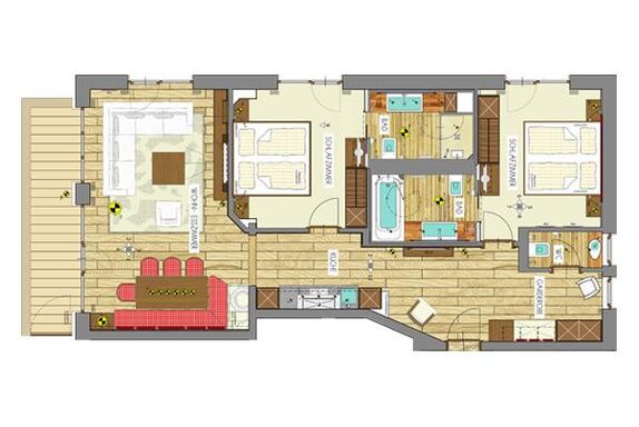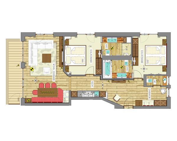 Die Nichtraucher-Appartements C im Erdgeschoß des Auriga-Appartementhauses verfügen über eine eigene Terrasse, auf der Sie den Zauber des Winters hautnah erleben. Alle drei Schlafzimmer haben Zugang zu einem eigenen Badezimmer en suite. Die gemeinsamen Wohnbereiche überzeugen mit edlen Materialien und Helligkeit.