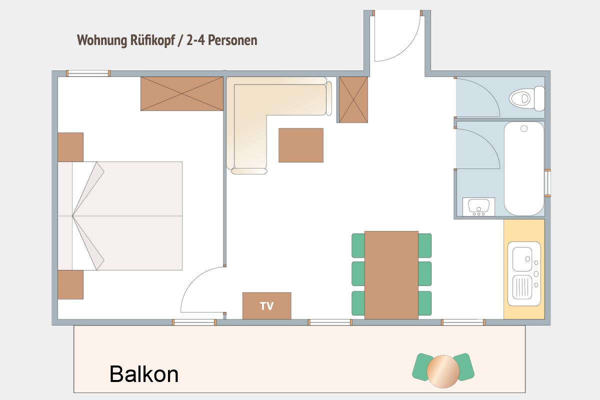 Ferienwohnung Nr. 2 Blick Rüfikopf Großzügig gestaltete Ferienwohnung für 2-4 Personen bestehend aus 1 Schlafzimmer mit Doppelbett, 1 Wohn-/Schlafzimmer mit großer Doppel-Schlafcouch, Küchenblock, Essecke. Diese Wohnung verfügt zusätzlich auch über einen gemütlichen Balkon. Neues Badezimmer mit Badewanne/Dusche, Waschbecken. Separate Toilette.