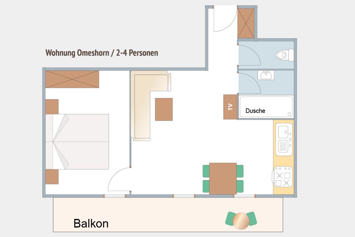Ferienwohnung Nr. 5 Blick Omeshorn Ferienwohnung für 2-4 Personen bestehend aus 1 Schlafzimmer mit Doppelbett, 1 Wohn-/Schlafzimmer mit Doppel-Schlafcouch, Küchenblock, Essecke. Neu renoviertes Badezimmer mit Dusche, Waschbecken. Seperates WC. Die Wohnung verfügt auch über einen Balkon.