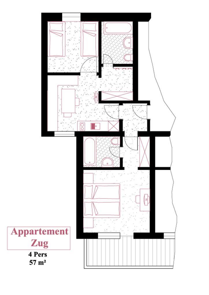 Ferienwohnung für 4 Personen - APT ZUG 1 Doppelzimmer/Bad/Wc/Tel/Cabel-TV/Balkon mit sehr schöner Aussicht 1 Zweibettzimmer(getrennte Betten)Bad/WC mit Föhn 1 Wohnküche mit gemütlicher Eßecke, 2 Plattenherd, Kühlschrank, Kaffeemaschine, Kabel-TV und Tel. NICHTRAUCHER APPARTEMENT Auf Wunsch ist täglich Brötchenservice möglich