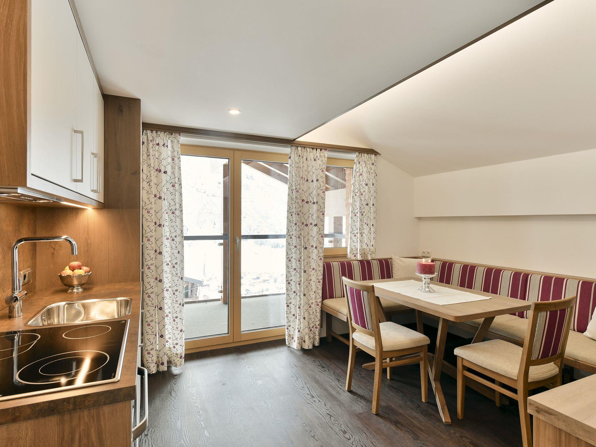Von der Terrasse aus die herrlichen Berge betrachten und direkt an der Schipiste wohnen. Die Hektik des Alltags hinter sich lassen. Urlaub machen. Appartement RÜFIKOPF - zwei Schlafzimmer, voll eingerichtete Küche, Bad mit Wanne und Dusche, WC getrennt - 53 m2, komplette Küche mit schönem Essbereich