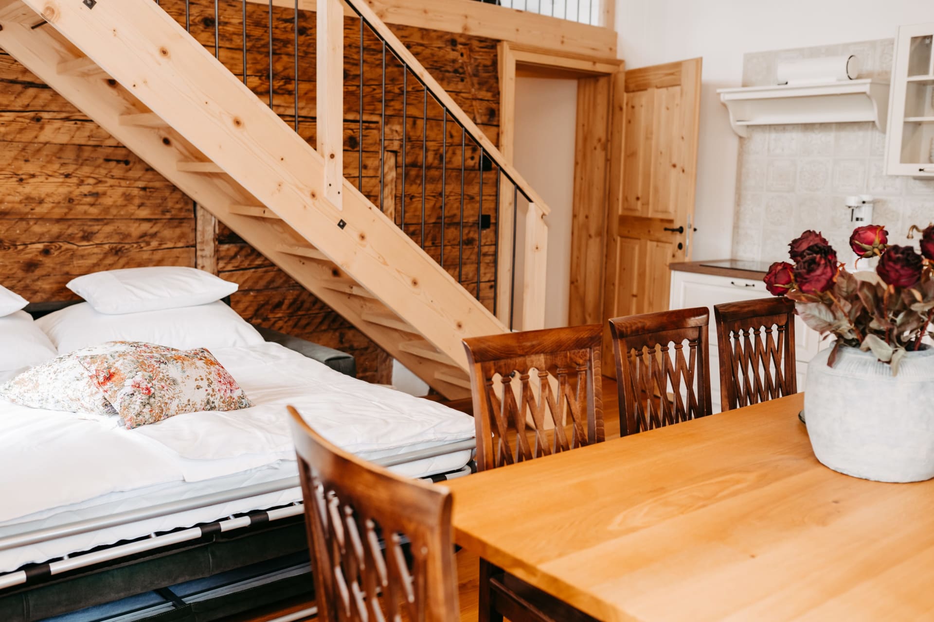 Wenn das Wetter einmal nicht mitspielt, steht im Stallgebäude ein großzügiger Raum zum Spielen bereit – mit Tischtennis und viel Platz zum Austoben (5 x 9,4 Meter). Im hofeigenen Laden findet ihr außerdem liebevoll ausgewählte Accessoires, Deko und Möbel – perfekt für alle, die Schönes lieben.