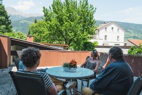 Nach einem Tag beim Wandern, Biken oder Skifahren können sie ihren Tag entspannt im Gemeinschaftsgarten/ Pergola mit offenem Kamin ausklingen lassen.