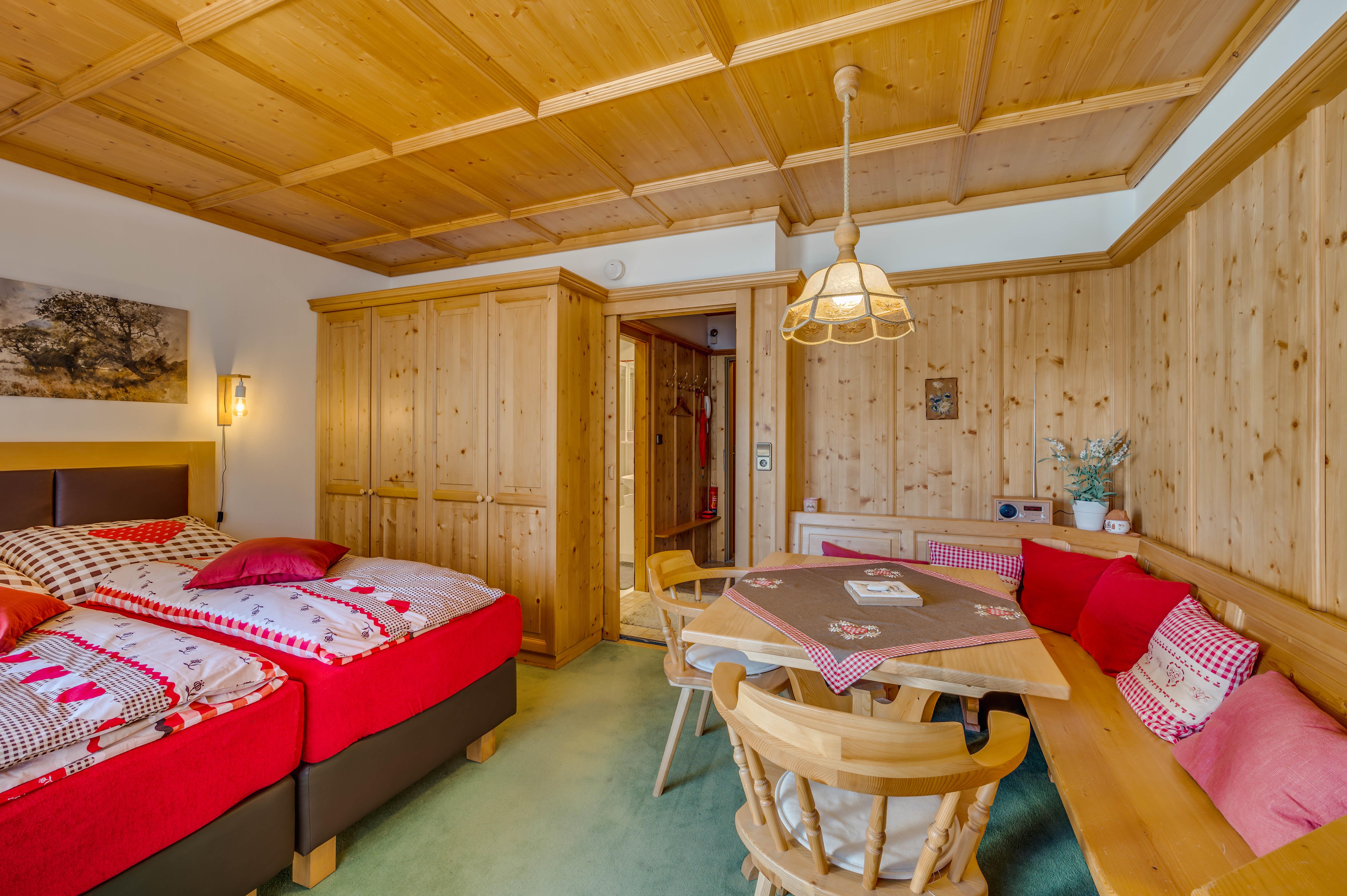 Im sehr gemütlichen Schlaf-, Wohn- und Essraum steht ihnen ein Doppelbett zur Verfügung. Zusätzlich befindet sich ein ausgedehnter Sitzbereich mit Eckbank, Tisch und Stühlen im Stubenstil im Raum.