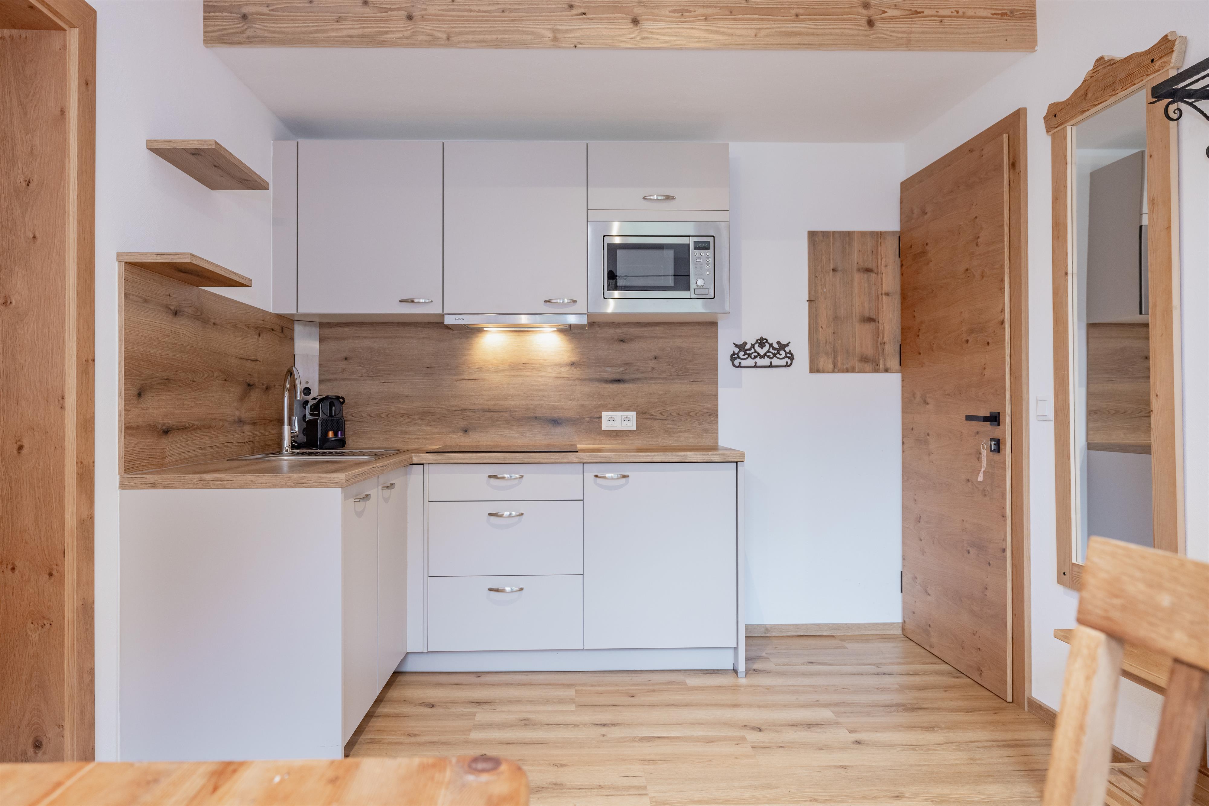 Küche mit Kühlschrank, Induktionsherd, Geschirrspühle, Mikrowelle, Kaffeemaschine bzw. Nespresso - maschine.