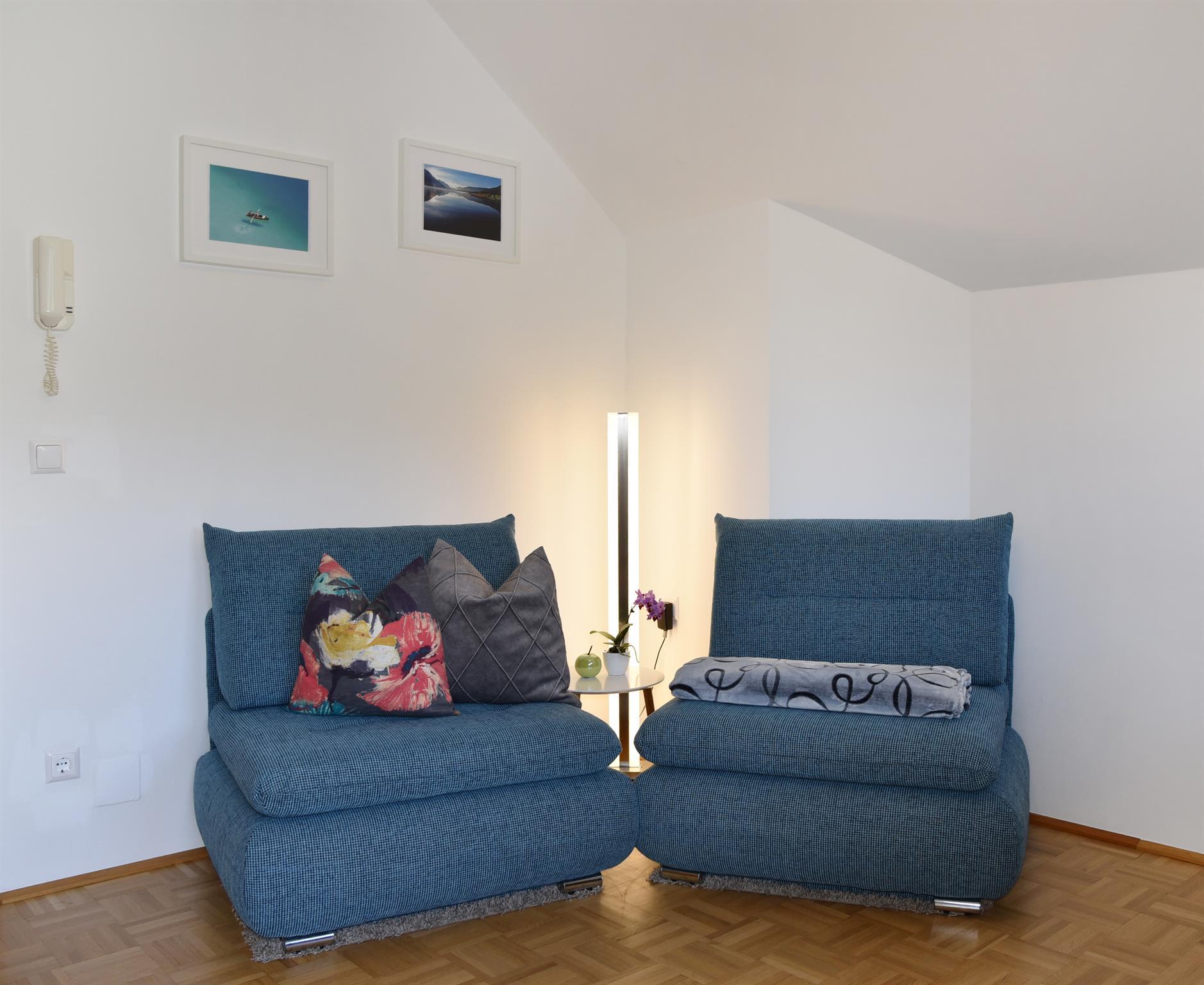 Unsere stilvoll eingerichteten Apartments sind der ideale Ort, um sich nach einem erlebnisreichen Tag zu entspannen. Mit hochwertigen Holzmöbeln, gemütlichen Sitzsofas und einer komplett ausgestatteten Küche bieten wir Ihnen alles, was Sie für einen komfortablen Aufenthalt benötigen. Jedes Apartment verfügt über zwei Balkone, auf denen Sie die frische Luft und den Blick auf den See genießen können. Im Erdgeschoss finden Sie eine einladende Terrasse mit Grillmöglichkeiten – perfekt für gesellige Abende im Freien.