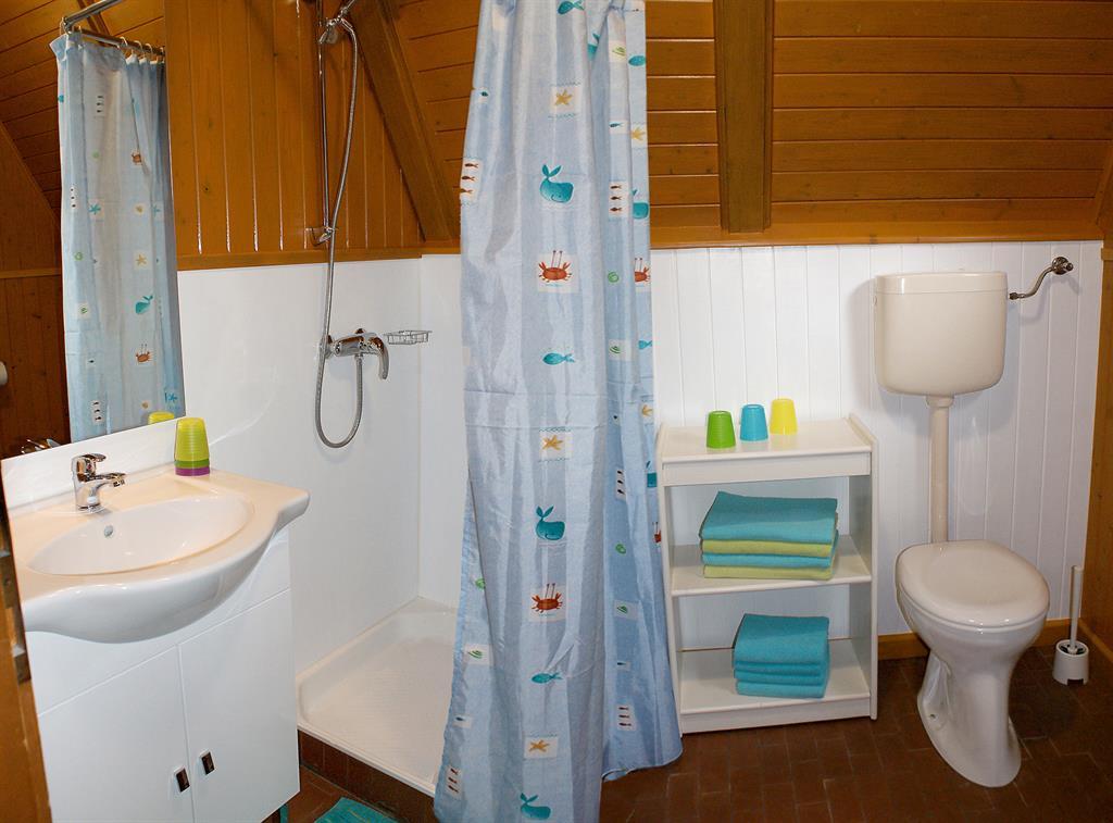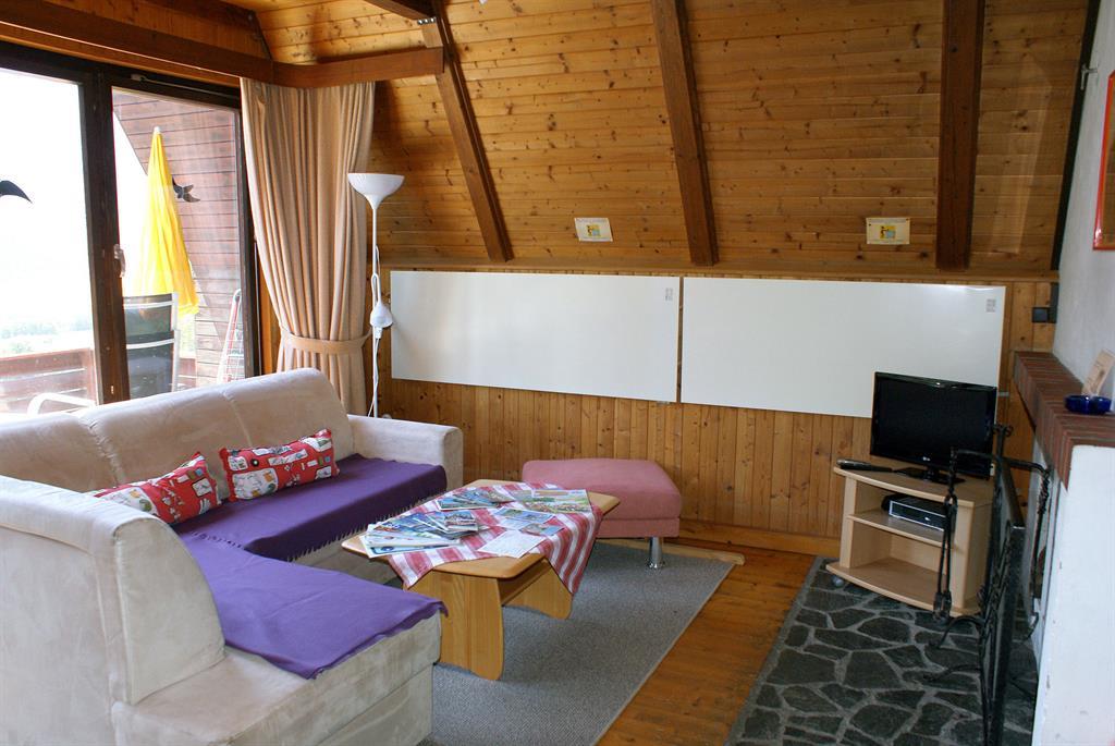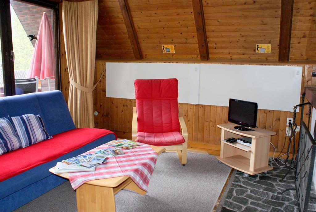 1 Wohnzimmer mit offenem Kamin, Sitzgarnitur, Sat-TV, Essecke, Balkon, 1 Schlafzimmer mit 2 Betten,1 kleine Küche mit Kaffemaschine, 2-Platten-Herd, Kühlschrank, Minibackofen, gesamtes Geschirr 1 Duschbad/WC ,E-Heizung i. allen Räumen, Vom Wohnzimmer geht eine Stiege ins O.G. zu dem 2. Schlafraum mit 3 Betten