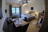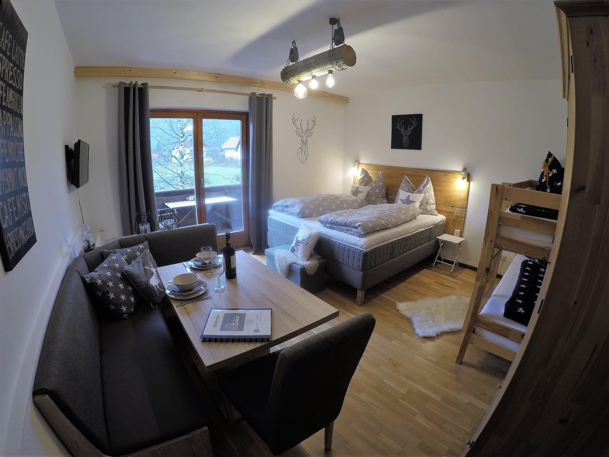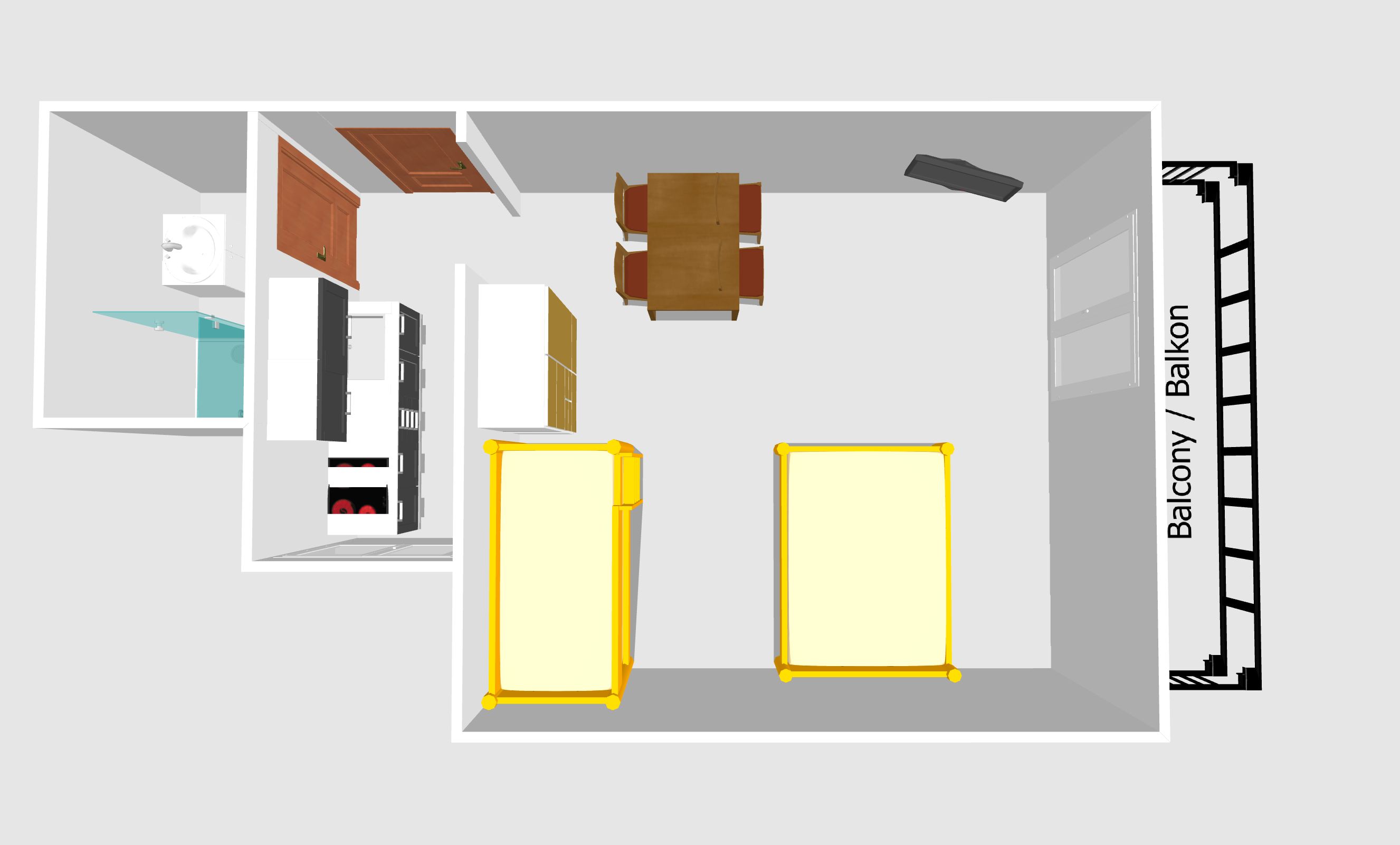 Das Apartment bietet Platz für vier Personen. Es gibt ein Schlafzimmer mit luxuriösen Boxspring Bett für zwei Personen und einen Zugang zu einem großen Balkon. Das Schlafzimmer hat ein zusätzliches Stockbett. In der Ferienwohnung gibt es ein modernes Badezimmer und eine vollausgestattete Küche mit Backoffen.