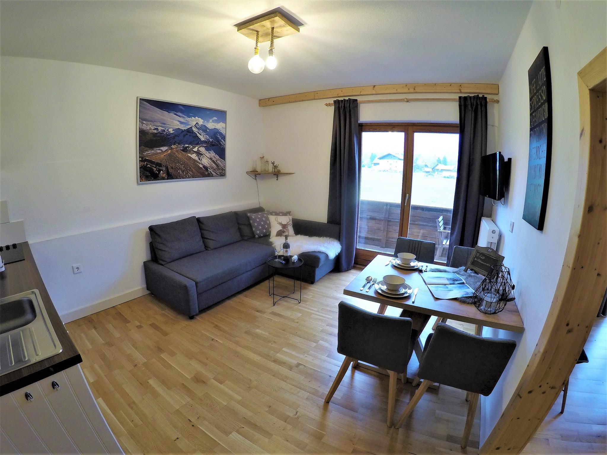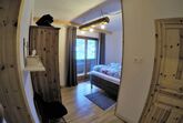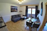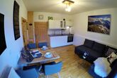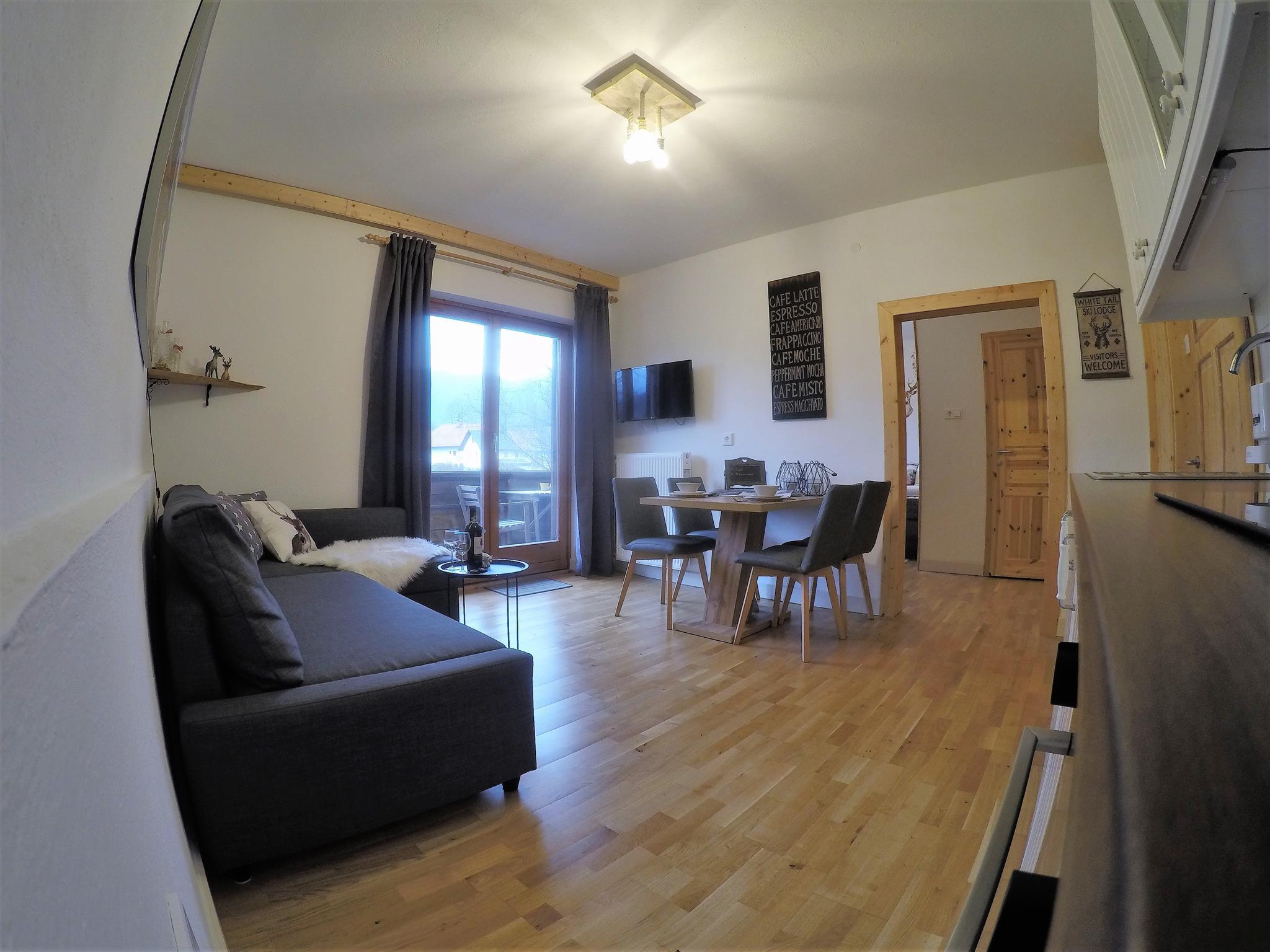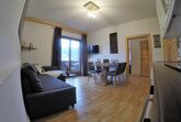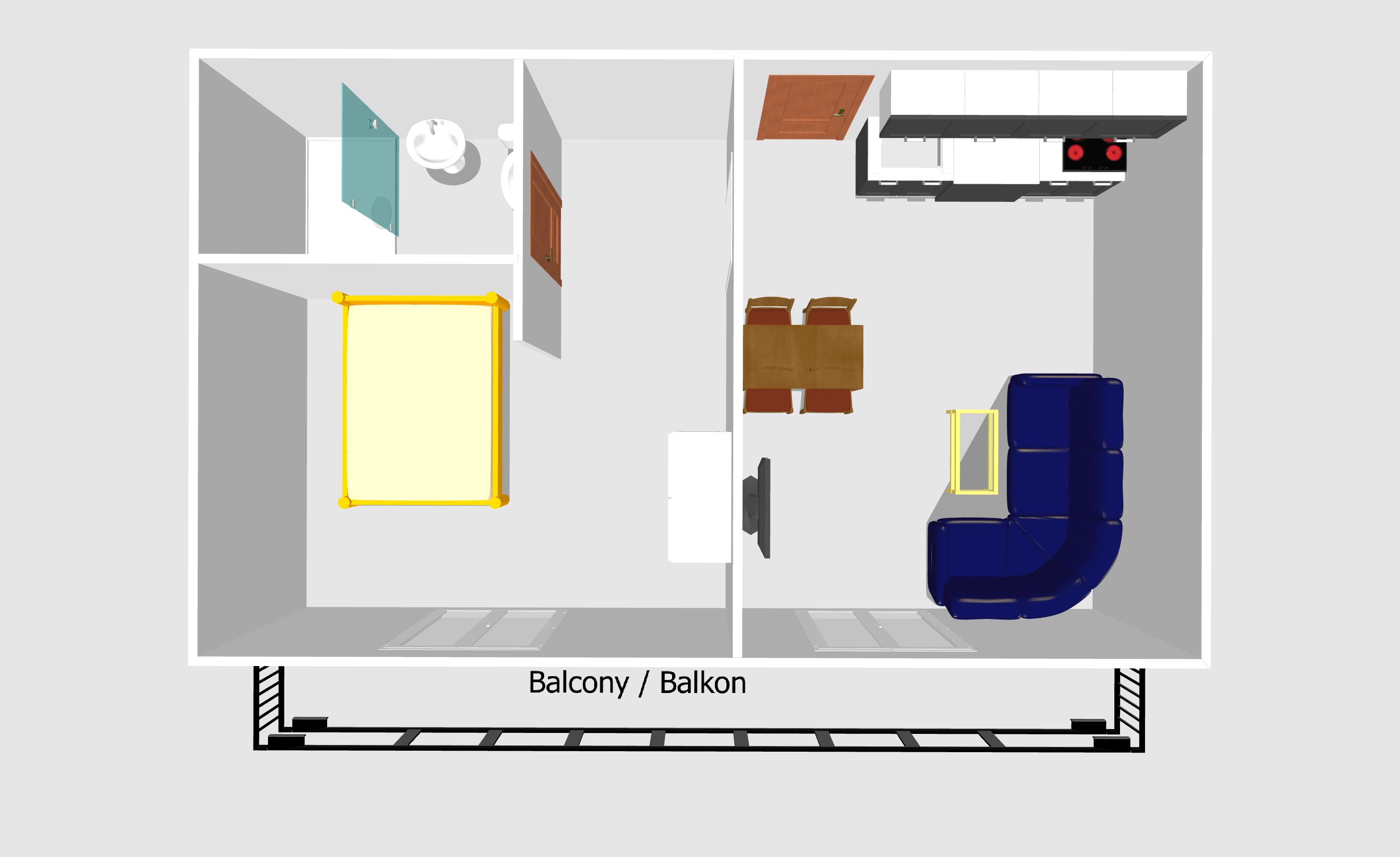 Das Apartment bietet Platz für vier Personen. Es gibt ein Schlafzimmer mit luxuriösen Boxspring Bett für zwei Personen und einen Zugang zu einem großen Balkon. Das Wohnzimmer besitzt eine komfortable Schlafcouch für zwei Personen und außerdem auch einen Zugang zum Balkon. In der Ferienwohnung gibt es ein modernes Badezimmer und eine vollausgestattete Küche mit Backoffen.