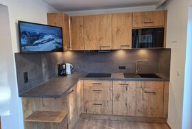 2-Zimmer-Wohnung für bis zu zwei Erwachsene und 1 Kleinkind. 1 Schlafzimmer mit Doppelbett, Wohn-Esszimmer mit Kochnische, Essecke und Ausziehsessel, Bad mit Dusche und WC, p.P. 1 Handtuch und 1 Badetuch, Balkon mit Blick auf die Berge. Liegewiese, Schaukel und Rutsche.