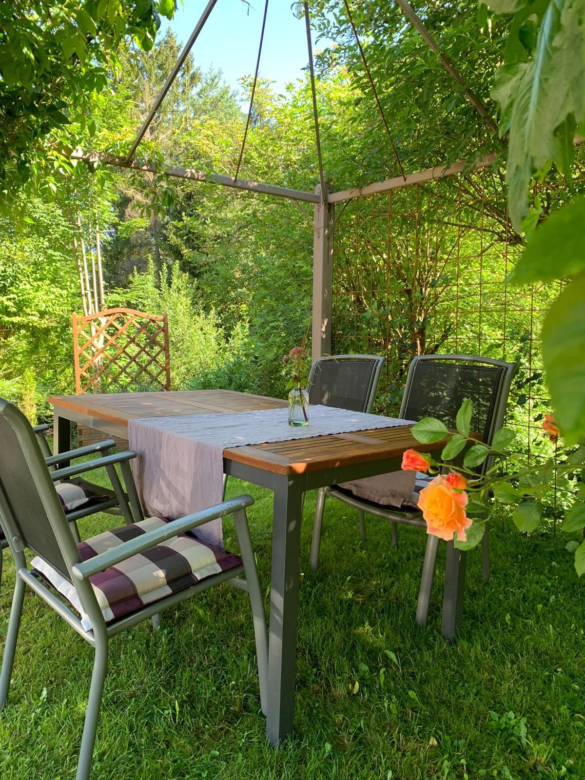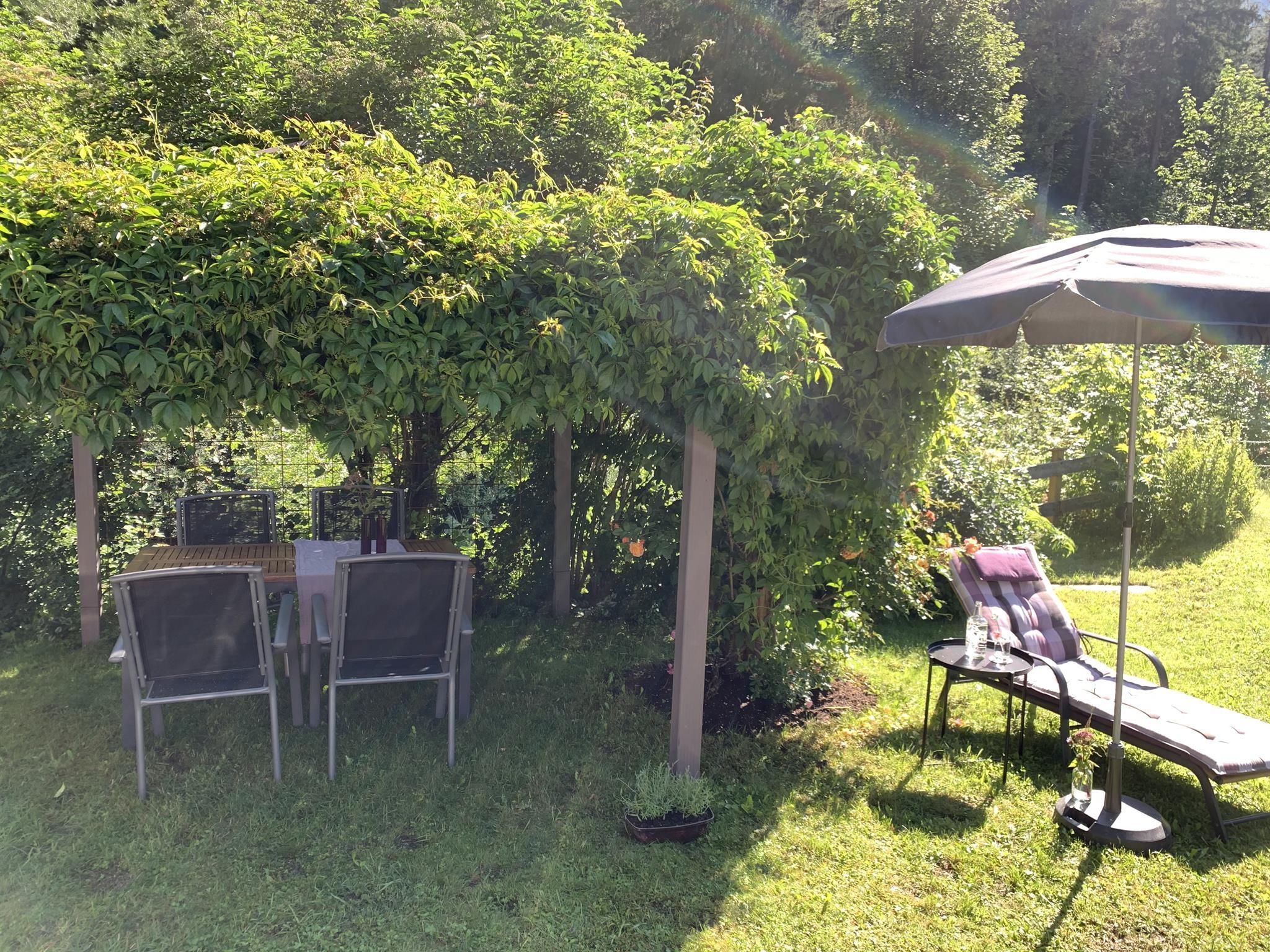 Im eigenen Garten unter einem mit wildem Wein zugewachsenem Pavillion kann man das Rauschen des Baches im Hintergrund geniessen.