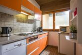Föhn. Farb-TV und Zimmersafe. Separate Küche mit 3-Platten-Elektroherd, Kühlschrank, Dunstabzug, Kaffeemaschine, Geschirrspüler, Mikroherd, Geschirrausstattung.