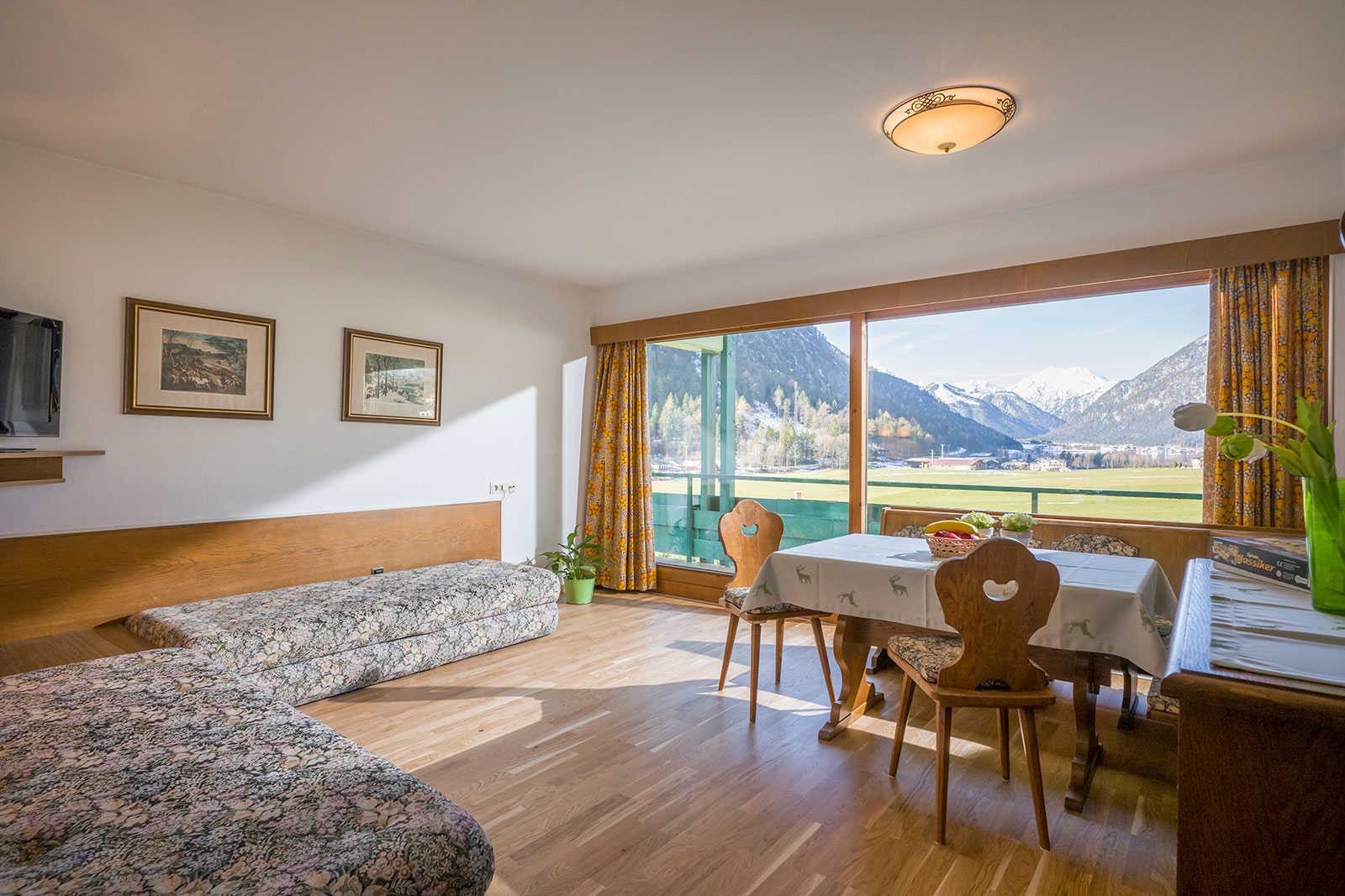 Wohnschlafzimmer mit 2 Couches und Tischchen, gepolsterte Eßecke und Bauernkomode. Großé Glas - Schiebetüren zum Balkon - Terasse, Schlafzimmer Doppelbett u. Couch, 2 Fauteuils und Tischchen, Wandvertäfelung. Große Glas - Schiebetüren zu den Balkonen bzw. Gartenterrasse, Vorraum mit Schrank Kinderbettchen und Kinderstuhl wird auf Bestellung in die Wohnung gestellt. Badezimmer mit Badewanne, Waschbecken, WC und Heizstrahler, Föhn