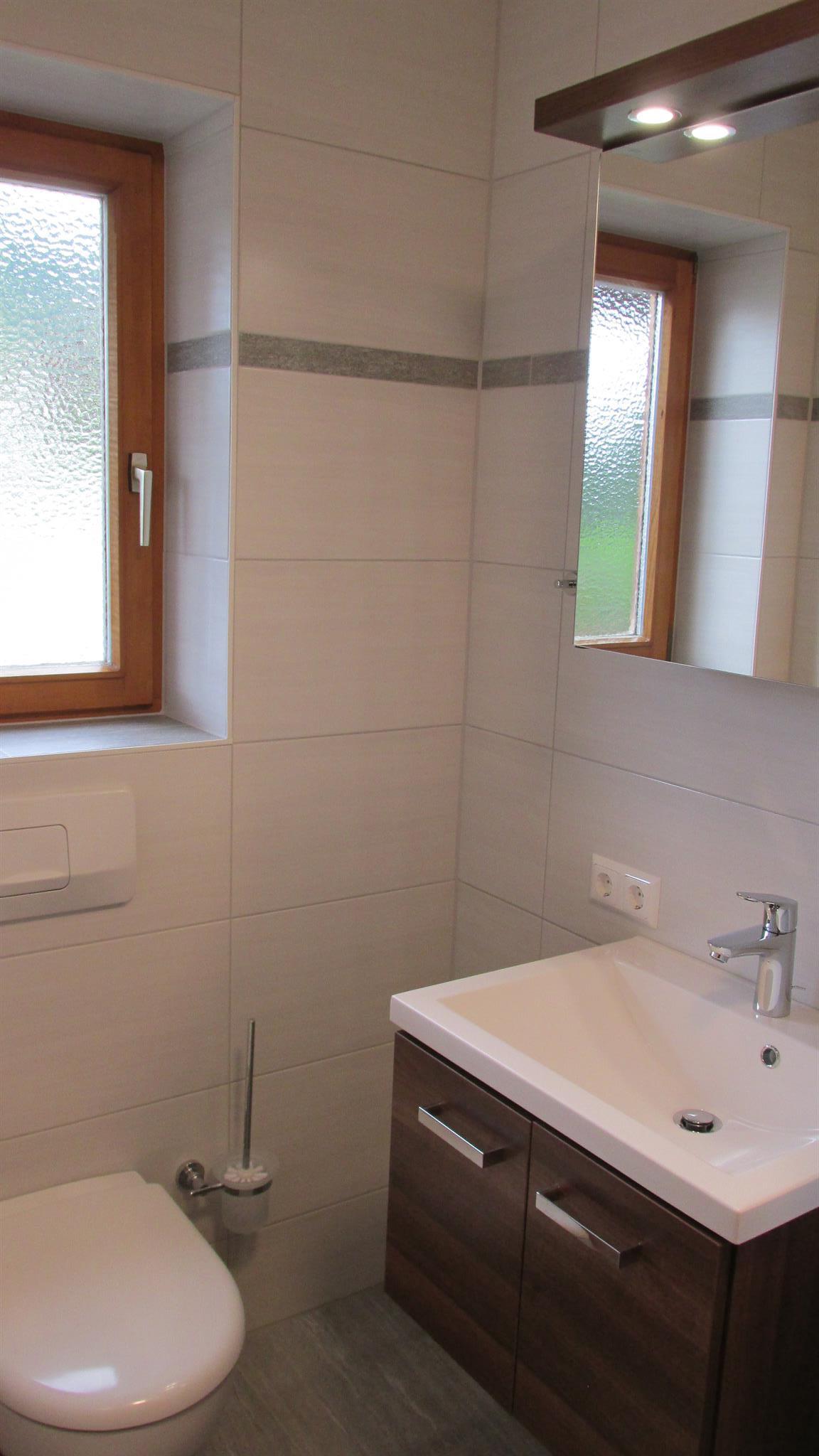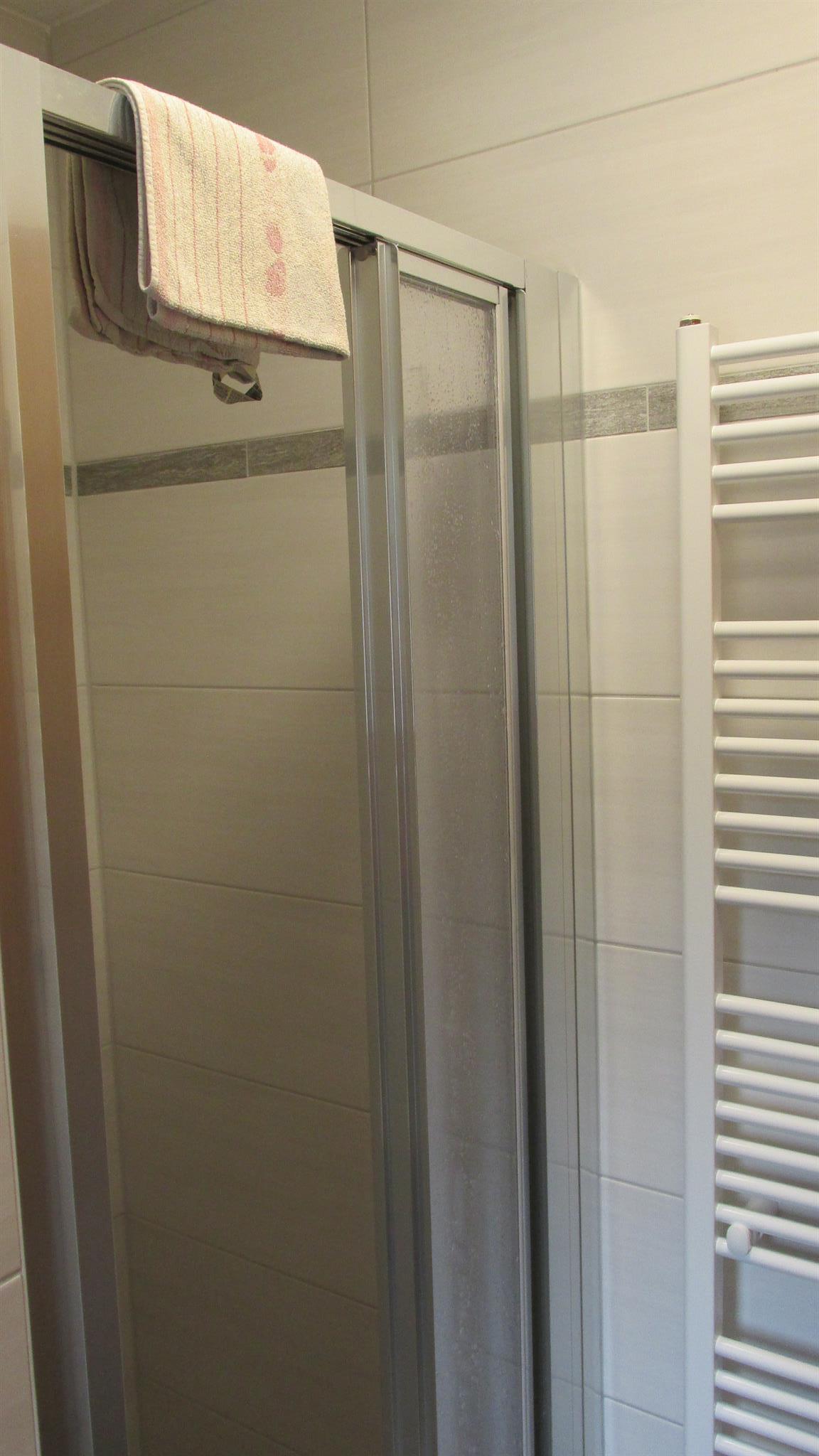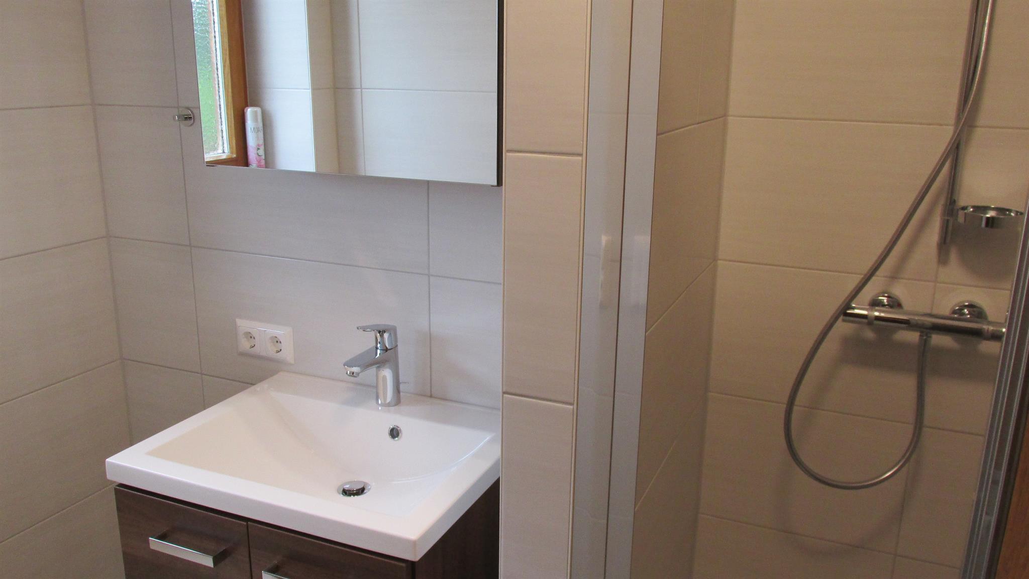 Im Badezimmer befinden sich die Dusche, ein Waschbecken und das WC.