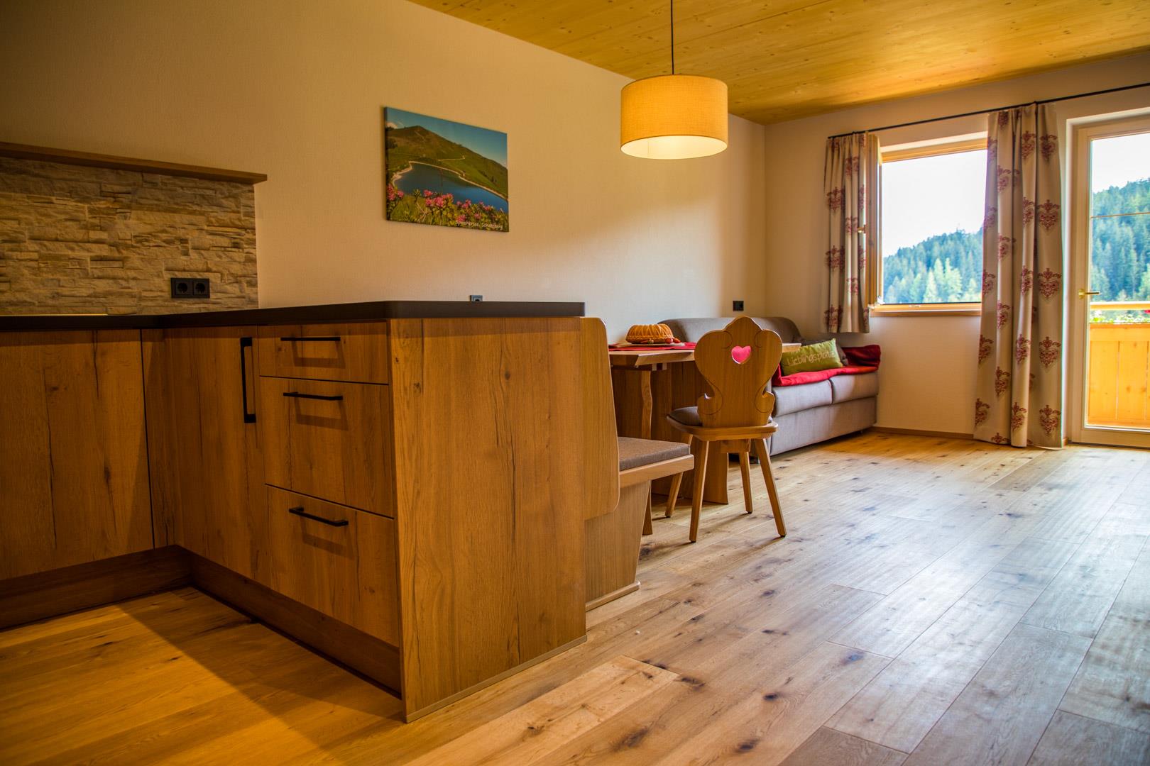 heimelige Holzdecke, Holz-Fußboden mit Bodenheizung, Holz-Garderobe, gemütliches Sofa(Schlafcouch),mit Sat-TV, Eckbank mit Holztisch, Süd-Balkon,Wlan