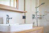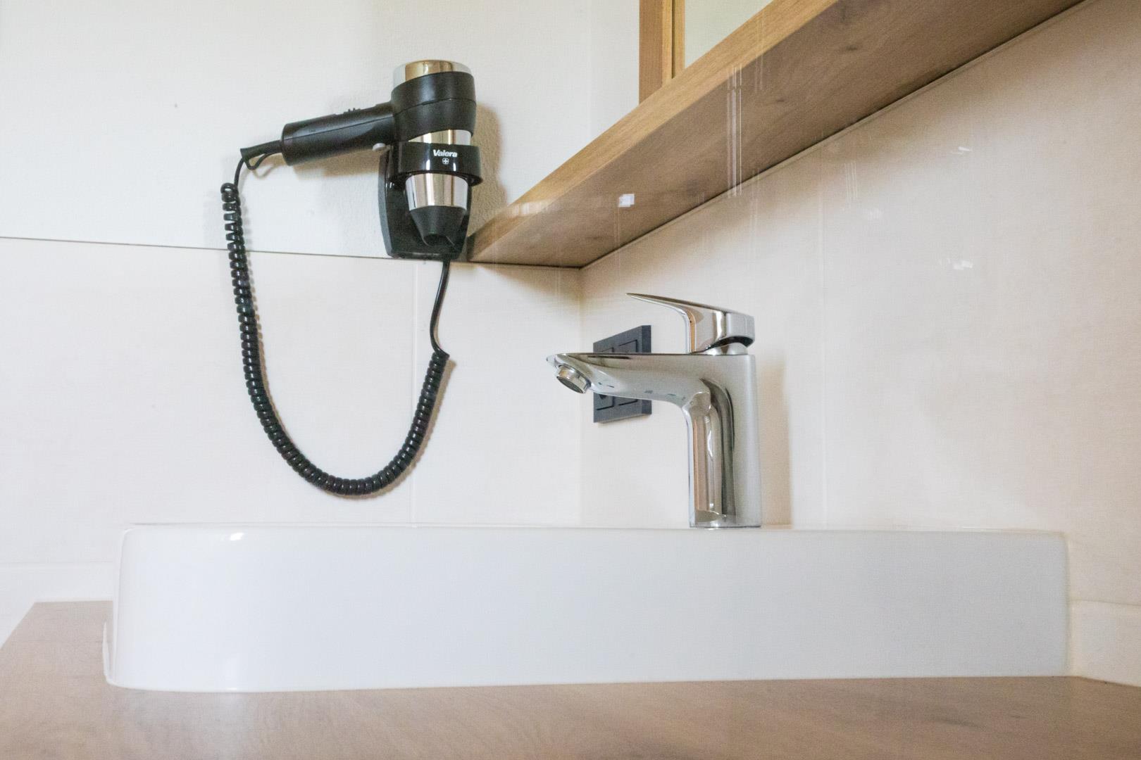 schönes großes Wohlfühl-Badezimmer mit Dusche, Handtücher und Föhn, getrenntes WC